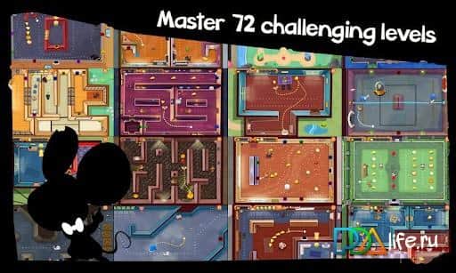 SPY mouse - эта аркадная головоломка для андроид познакомит вас с маленьким шалунишкой - мышонком! Серенький смельчак решил полакомится сыром, и для этого ему нужна ваша помощь. Задача в том, чтобы проложить себе путь к сыру, а потом к норке, ведь на мышонка охотится кот! Как вы справитесь с котом - дело ваше - отвлеките его телевизором или просто схитрите, отступите, когда он начнет на вас прыгать, а может придумайте что-нибудь еще. Главное - добраться до цели - сыра и убежать в норку! 70 уровней динамичного геймплея с включенными мозгами! Множество миров, локаций и скрытые уровни! Мультяшная графика и заряд хорошего настроения!