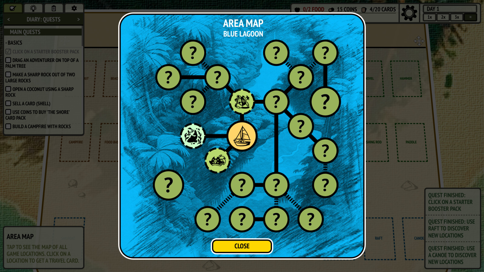 Итак... Первые 5 минут геймплея пытался понять, что, как и зачем... Но потом я пробежался по экрану глазами и заметил, что в левом верхнем углу есть несколько кнопок (квесты, идеи [они же крафты], и еще 2)... Чтобы находить идеи крафтов надо покупать бустерпаки, осуществляется это тем, что надо перетащить монеты на какую-либо категорию... На первой локации это "Берег", "Пальмовая роща" и "Дюны"; покупка каждой категории дарует бустерпак со своим набором карт... Крафты осуществляется так, что надо перетащить в некоторых случаях карту героя на какие-либо составляющие и мы получим тот или иной предмет... В общем игра для любителей карточных игр и капельки запутанности