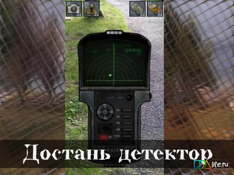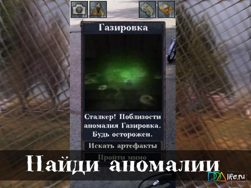 Перепишите описание согласно скриншотам: "При помощи детектора найти аномалии и поймать артефакты."