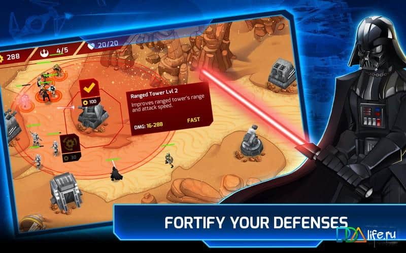 Star Wars : Galactic Defense - игра, в которой вы будет защищать галактику от злых сил. Выбирайте одну из сторон светлую или темную, и сражайтесь вместе с ними завоевывая вселенную. Разрабатывайте свою стратегию, разверните свой арсенал оружия и стройте оборонительные башни для лучшей защиты. Вас ждут различные места сражений, известные из Звездных воин, а также различные сценарии ведения боя. Играйте со своими друзьями и соберите непобедимую команду воинов и сражайтесь как Люк Скайуокер, Оби-Ван Кеноби и Йода каждый из которых имеет уникальные способности.
