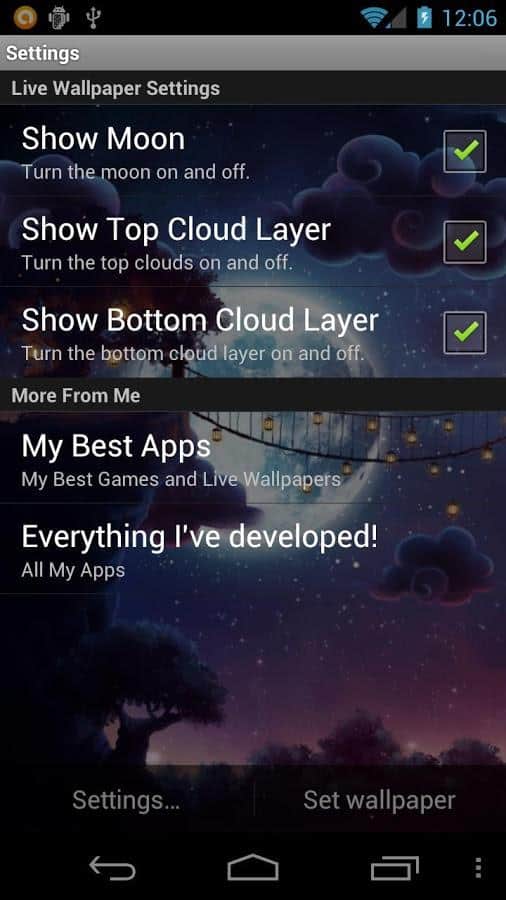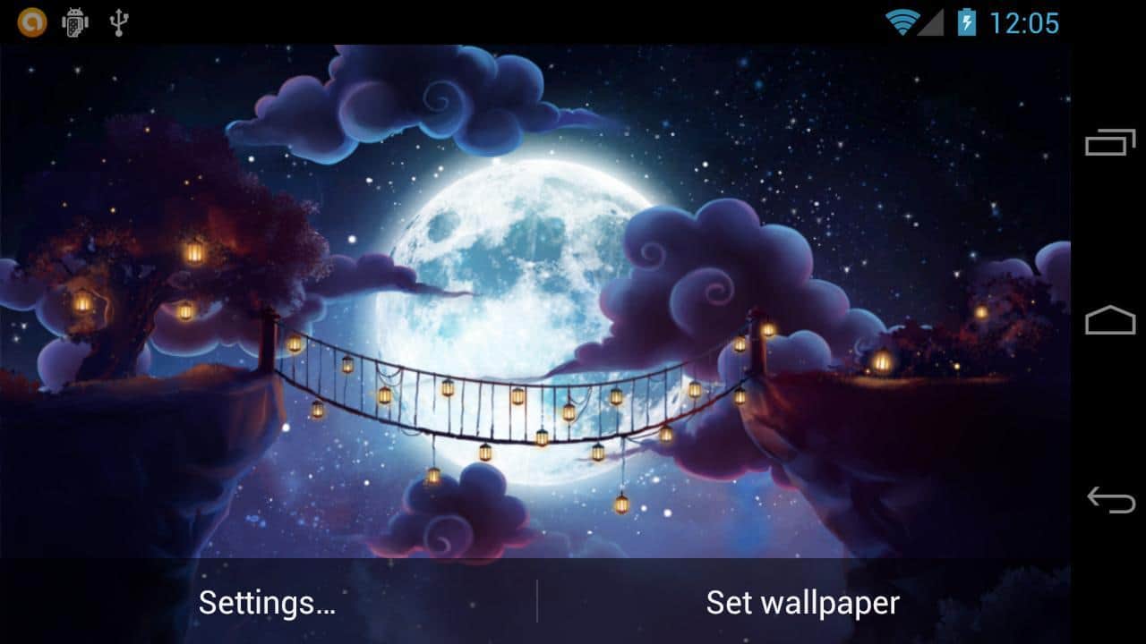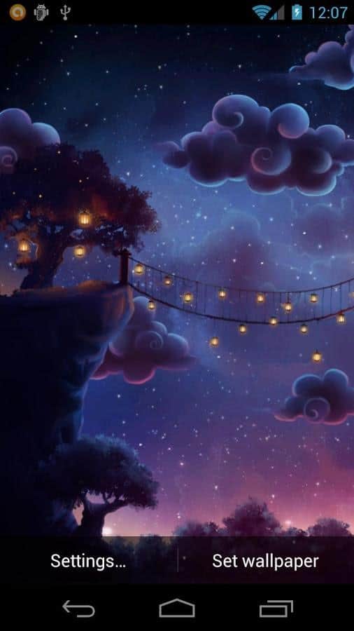 Starry Night Pass Wallpaper – сказочные живые обои на андроид, которые перенесут вас в удивительный ночной мир с множеством огоньков. Благодаря этим обоям вы будете наблюдать на экране своего телефона подвесной мост с большим количеством бумажных фонариков на фоне огромной луны. Ночное небо, освещаемое множеством огоньков звезд мерцающих в темноте, и неспешно плывущие облака будут радовать вас не только в ночное время суток, но и днем. Устанавливайте эти потрясающие живые обои на свой телефон и наслаждайтесь открывающимися видами и меняющимися настройками.