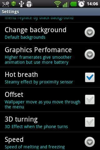 Очень преалестичная прорисовка капель, они как настоящие! С ними можно делать, все что угодно: катать по экрану, рисовать, сливать вместе, устраивать гонки между каплями. А если Вам не хватает пара, подышите на экран как можно ближе и он снова запотеет. Так что советуем скачать живые обои android 2.1 и удивить себя и друзей!