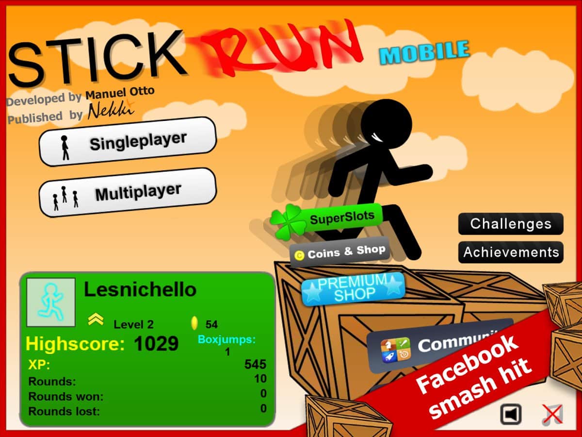 Stick Run Mobile - Новый онлайн раннер, пришедший на андроид платформу из социальной сети Facebook. Игра в соц. Сети собрала уже около сорока миллионов симпатий, и завоевали около шести миллионов постоянных игроков. В игре вам нужно бежать по случайно сгенерированном уровне с смертельными препятствиями. Вас ждет приятная графика, удобное управление и интерфейс.