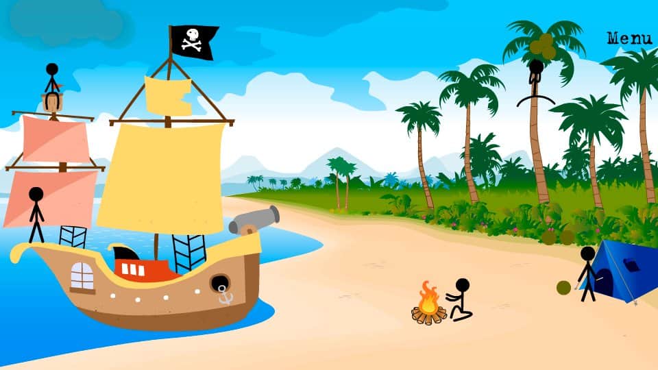Который наверху нажми на небо его молнией ударет пушка убьёт двоих,нажми на море акула съест другого,нажми на пальму он упадёт