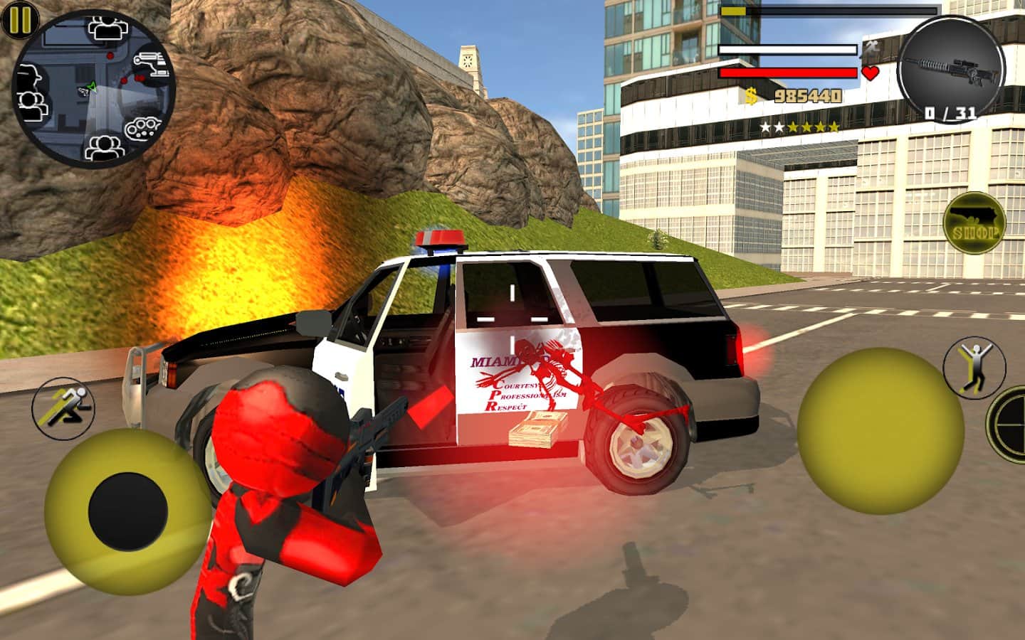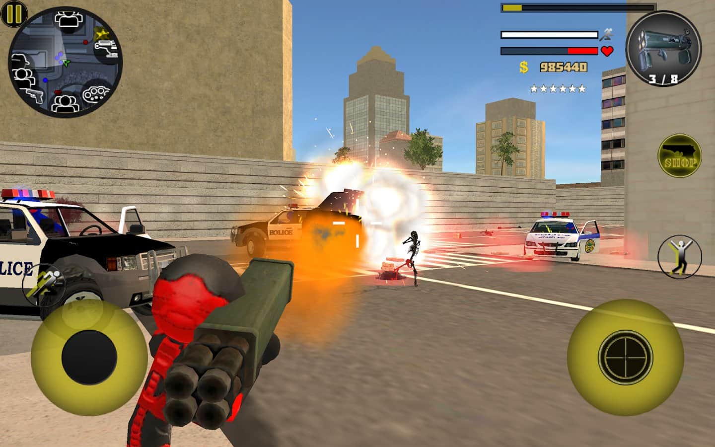 Stickman Rope Hero – возьмите под свой контроль стикмена и проведите его по улицам огромного мегаполиса, уничтожая своих клонов. В этой игре вы вместе с главным героем будете исследовать улицы города и находить врагов. Угоняйте различные транспортные средства, такие как автомобили, мотоциклы, танки и даже вертолеты. Используйте машины для того чтобы догонять врагов и давите их колесами, а также не забывайте про многочисленное оружие представленное в игре. Играйте в эту игру и совершайте невероятные подъёмы на небоскребы используя веревку, а также спуски. Следите за картой, которая будет указывать вам дальнейший маршрут. Собирайте по пути многочисленные предметы и трофеи.