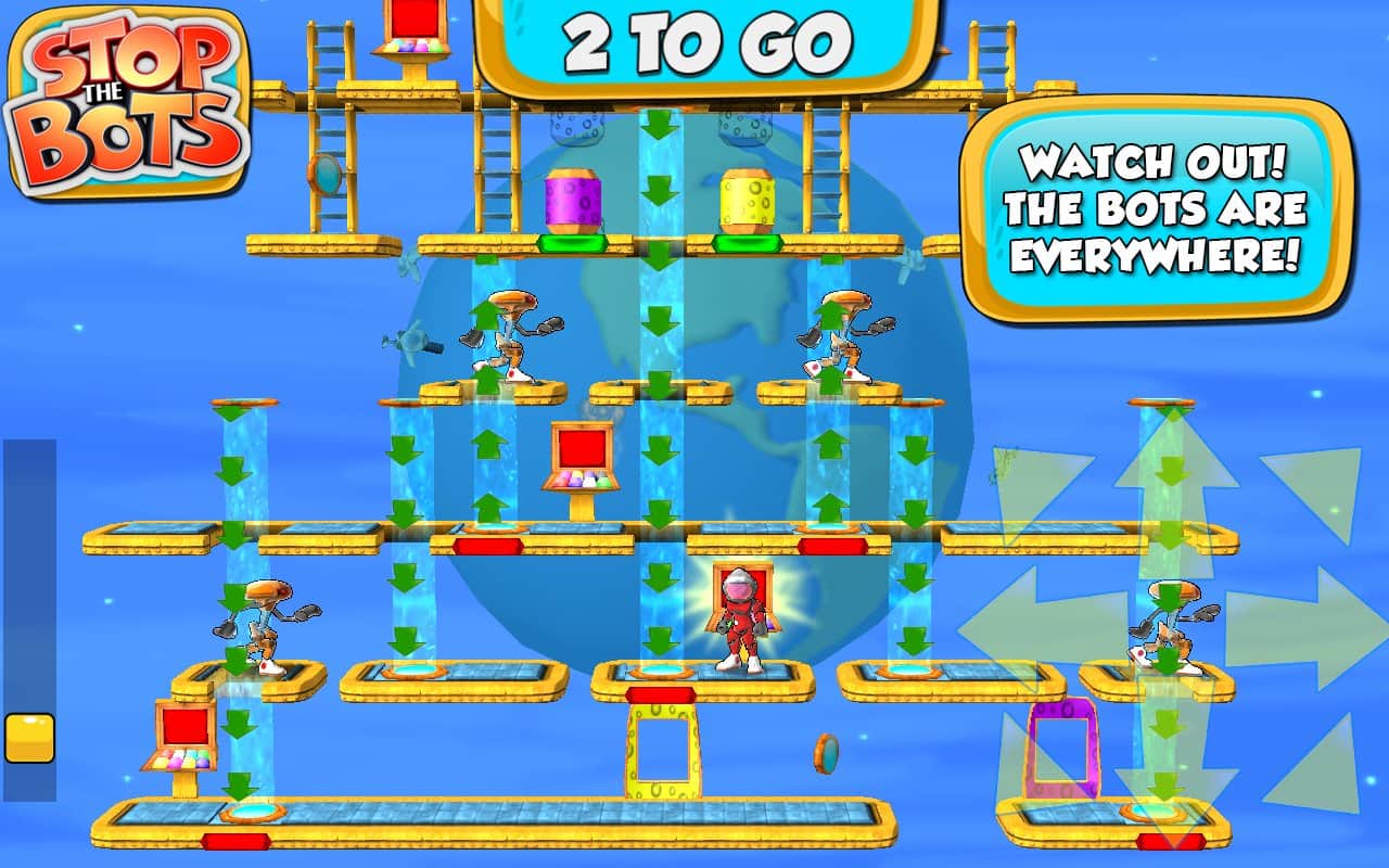 Stop the Bots - игра головоломка, в которой вам предстоит отключить корабль инопланетного робота для того, чтобы он не напал на планету Земля. Ходите по различным уровням и собирайте нужные вам детали быстрее робота, который будет следовать за вами по пятам. Игра сочетает в себе головоломку с аркадными действиями, где вам на протяжении 90 уровней придется обходить препятствия и избегать встречи с роботом.