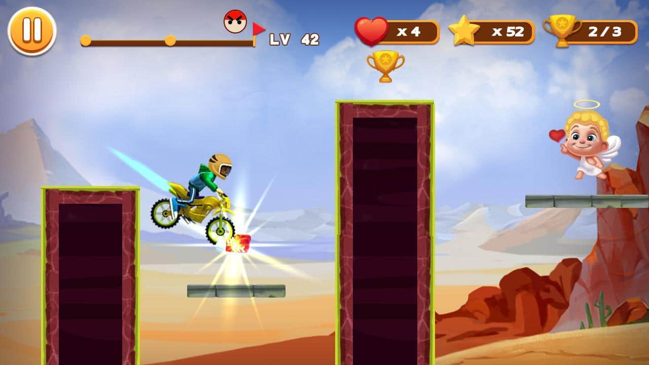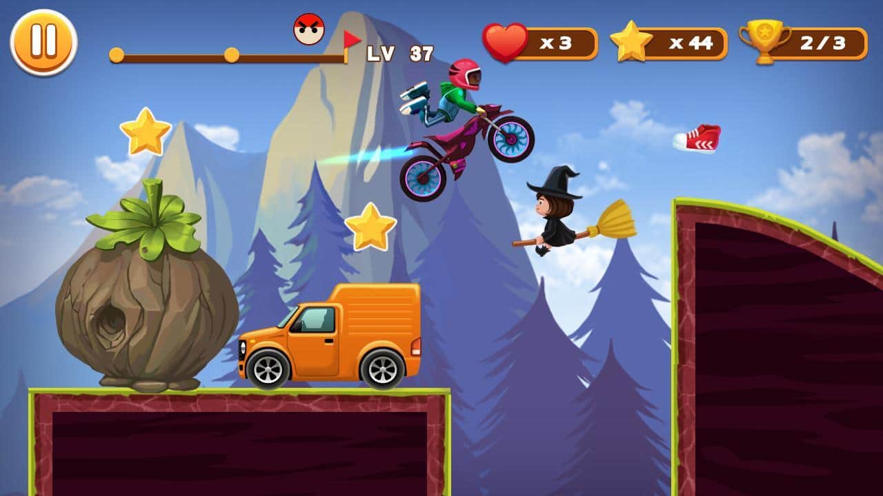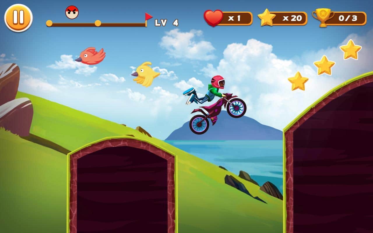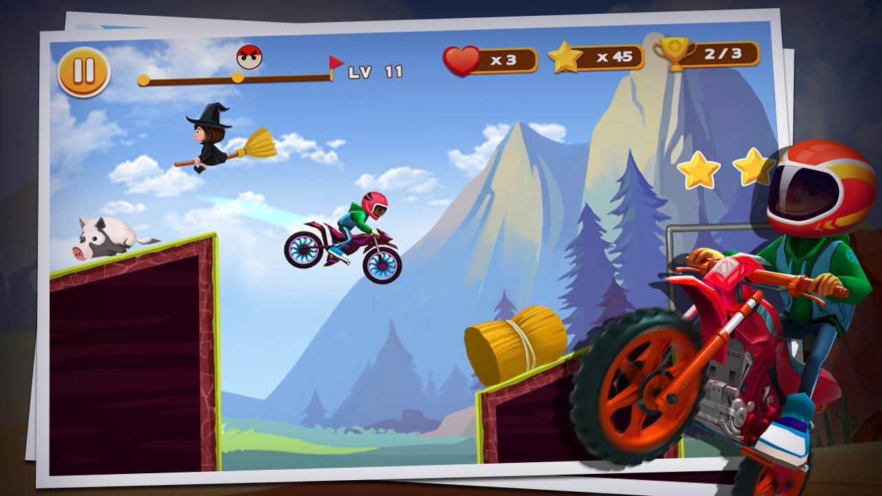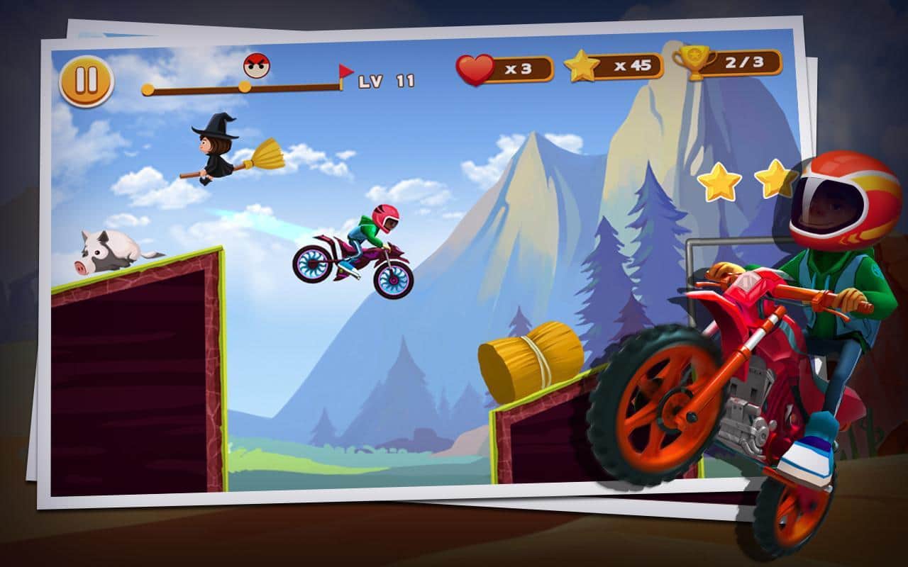 Stunt Moto Racing – гонки на мотоциклах по опасным трассам с яркой графикой. В этой игре вы сядете за руль горного мотоцикла и проведете его по различным трассам этой игры. Разгоняйте свой мотоцикл до предельных скоростей и на огромной скорости преодолевайте все преграды в виде, платформ, трамплинов, летающих ведьм и обрывов. Выполняйте головокружительные трюки и получайте ценное вознаграждение. Подлетайте вверх на трамплинах и кружитесь в воздухе, выполняя сальто. Не разбейте свой мотоцикл по пути и доберитесь до финиша за минимальный промежуток времени. Собирайте по пути золотые звездочки и многочисленные бонусы.