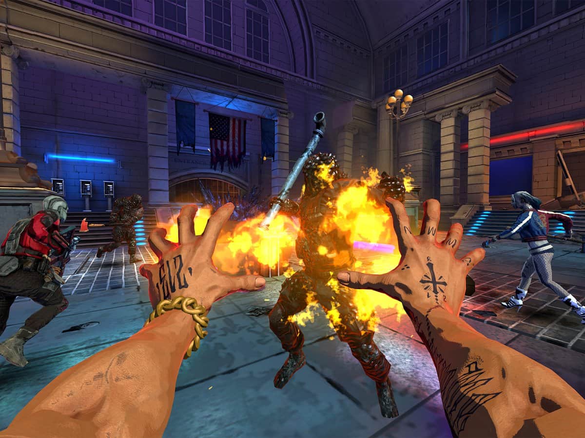 Неплохой способ убить время, но быстро надоедает. Есть три разных персонажа: Харли Квин, Дедшот и Эль Дьябло. У Харли есть бита которую она использует в ближнем бою и магнум; у дедшота есть в штурмовая винтовка, а также пистолеты на запястьях с бесконечными патронами; у Эль Дьябло есть только способность пускать пламя из рук, но оно не требует понять боезопас, а лишь переодически перезаряжаться, что занимает где-то две секунды. У трёх персонажей также есть и свои необычные способности которые можно использовать полностью заполнив шкалу. У Харли способность заключается в том что она замедляет время и если подбежать к врагам то с одного удара битой убьёт его, но есть минус что в это время вы всё ещё уязвимы для пуль и ударов; Дедшот практически останавливает время на короткий промежуток что позволит разорвать головы врагов на куски; у Эль Дьябло, по моему мнению, лучшая способность, он наносит огромный урон всем ближайшим врагам. В самом начале игры, во время обучения, локация будет постепенно открывать новые секции, после чего станет полностью доступна. Примерно каждые две волны появляются контейнеры, подойдя к которым вы сможете выбрать одно из двух улучшений, также рядом с контейнером могут стоять враги, подойдя к которым начнётся новая волна и вы сможете получить улучшение только после её завершения. Есть улучшения наносимого урона, размера магазина, скорости перезарядки, мощности особой способности, частоты выпадания с зомбэ востоновлялок здоровья, а также можно восстановить здоровье на максимум и получить дополнительную броню. С каждой главой появляется всё больше сложных врагов. В качестве врагов в игре есть зомбяки которые бегут на прошлом и наносят урон вблизи, далее зомбяки с винтовками, жирные зомбяки с топорами, бегущие на прошлом и требующие выпустить в них много пуль, ещё более жирные зомбяки с дорожными знаками, толстенные зомбяки с газовыми баллонами которые взрываются если подойдут близки, но также можно и взорвать их самому если удачно выстрелить по баллону, и зомбяки с пулемётами. Также почти что все зомбяки могут перепрыгивать большие препятствия, а ещё они всегда знают где вы находитесь и стреляют ровно в вас где бы вы ни были. Очень легко можно убивать зомбяр с оружием просто бегая вокруг них в одном направлении, они не смогут ничего сделать. После смерти всё сбрасывается. После первой игры нажав на кнопку "Начать" можно будет выбрать персонажа за которого в будете играть в начале, посмотреть какое оружие он использует, как зарядить особую способность и его небольшую биографию. Также станет доступен режим экстрим который сильно усложнит игру.