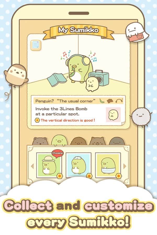 Sumikko gurashi-Puzzling Ways – увлекательная игра из жанра четыре в ряд на андроид. В этой игре вы окажитесь в забавном мире многочисленных милых мордашек животных, где вашей задачей будет соединять их в ряды и убирать с поля. Каждый новый уровень игры преподнесет вам новые задачи и миссии, где вы будете убирать с поля определенные цвета. Решайте непростые задачки и набирайте максимальное количество звезд. Играйте под приятную музыку и тренируйте свою отличную реакцию и логику складывая по четыре и более одинаковых мордочек в ряды по горизонтали, вертикали и диагонали. Применяйте бонусы и усиления и быстрее проходите уровни.