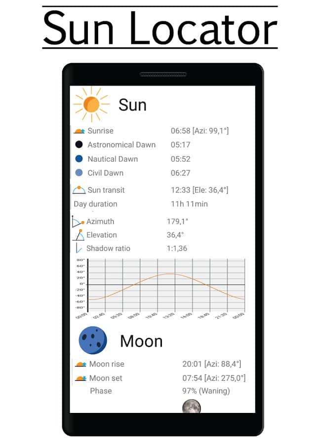 Если вы хотите знать, в каком положении находится Луна и солнце в течение года и ежедневно, тогда приложение Sun Locator удобным способом расскажет вам об этом. Особенности: