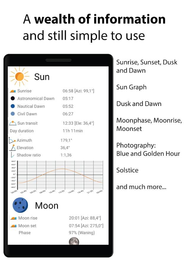 Отображение времени захода, восхода солнца, начало сумерек, лунных фаз