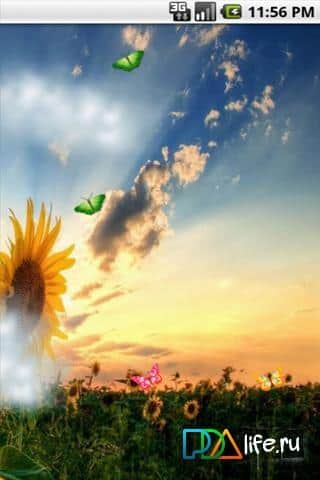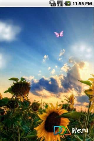 Sunflower Field Live Wallpaper - прекрасные живые обои с цветами солнца для андроид. Подсолнухи - прекрасная визитная карточка теплого лета. Плывущие по небу облака и яркое солнце… Если нажать на облако, оно превратиться в порхающую бабочку и улетит. Небольшое количество настроек, прекрасное и качественное исполнение подарит вам на долгое время ощущение тепла и отдыха.