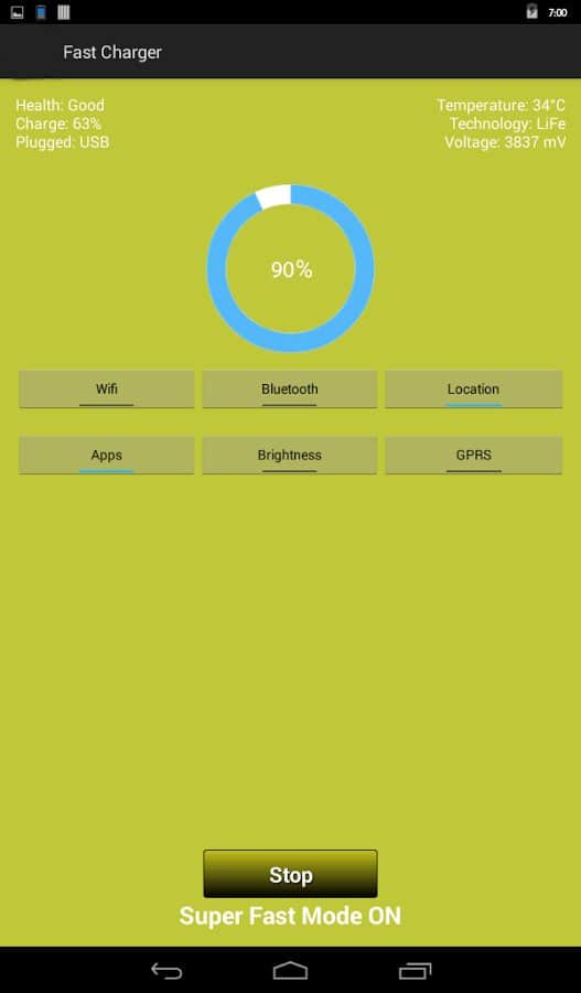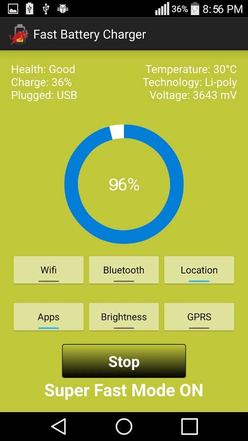 Super Charger – если вам требуется максимально быстро зарядить ваше устройство, то данное приложение от разработчика blue brain, подойдет вам как нельзя кстати. Как это работает? Скачав и установив данное приложение, нажмите на кнопку «Запустить супер зарядку». Super Charger автоматически прекратит все фоновые процессы и отключит беспроводные сети, которые возобновят свою работу при нажатии на кнопку «Выход». Таким образом, вы сэкономите до 50% времени затраченного на заряд аккумулятора устройства. Приятного пользования!