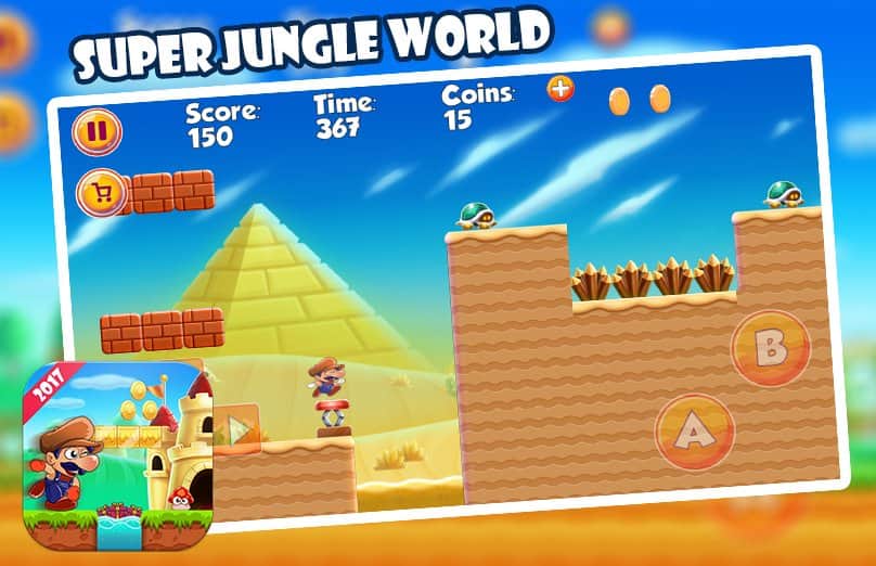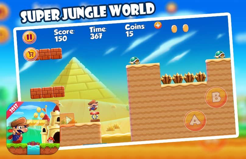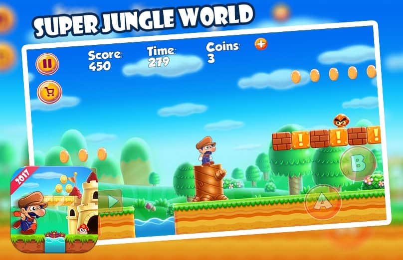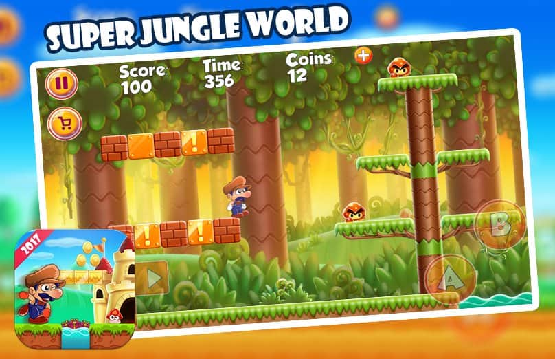 Super Jungle World – платформер на андроид, где вы будете управлять главным героем которому предстоит пройти немало испытаний. Ведите героя вперед по опасным джунглям населенным многочисленными врагами и собирайте по пути множество бонусов и усилений. Прыгайте по специальным платформам и разбивайте кирпичные стены, где спрятаны бонусы. Впереди вас ждет множество опасностей и приключений, где вы пройдете более 200 уровней игры. Путешествуйте по разнообразным мирам и вступайте в бой с врагами, прыгая на них сверху. Играйте в эту игру и получайте удовольствие от яркой красочной графики, простого управления и забавного героя.