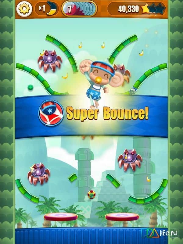 Super Monkey Ball Bounce - арканоид от фирмы SEGA, возвращается в совершенно новом исполнении. Отправляйтесь вместе с обезьянкой АйАй в забавное путешествие на поиски ее друзей. Совершайте головокружительные прыжки, отталкиваясь от движущейся платформы и скользите по желобкам и спиралям, собирая как можно больше бананов и бонусов. Вас ждут разнообразные миры, начиная от джунглей и заканчивая вулканами и ледниками, а также большое количество разнообразных уровней с увеличивающейся сложностью.