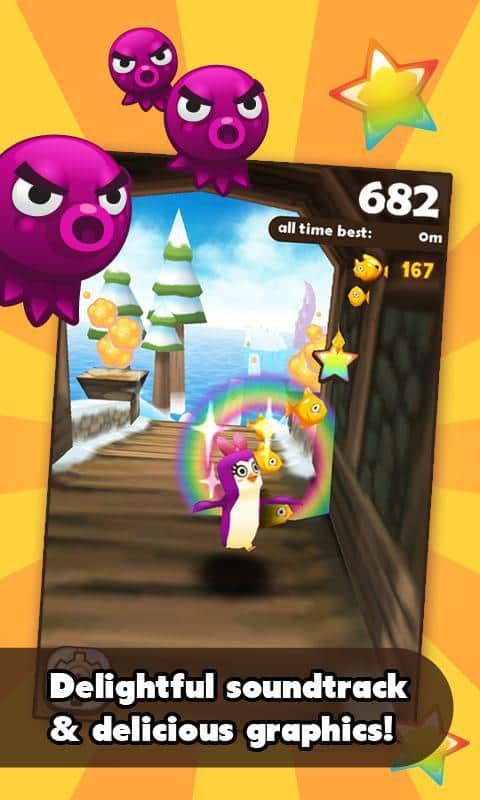 Super Penguins - игра из жанра раннер на андроид, то есть вам предстоит бежать и бежать, собирая различные бонусы. Играя за маленького храброго пингвинчика спасти его друзей, попавших в щупальцы осьминога. Вам следует поторопится, бегите как можно быстрей, иначе ваши друзья станут обедом осьминога.