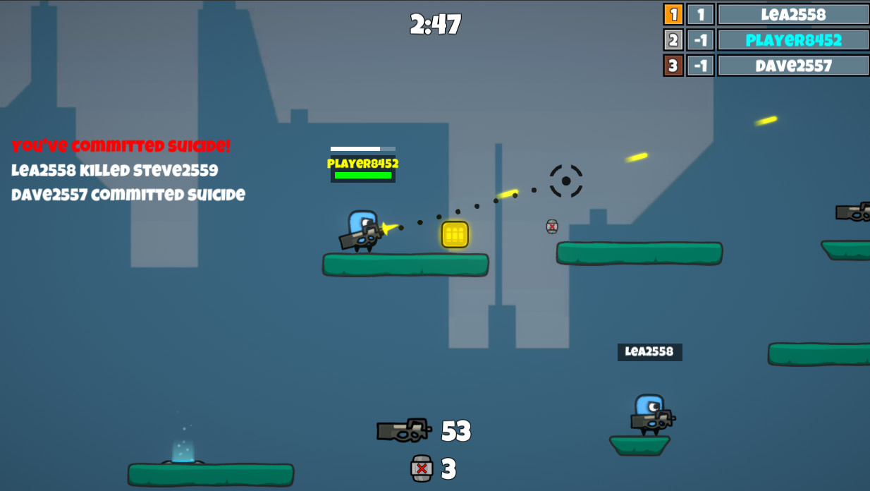 Super Shape Shooter — это динамичный и забавный 2D онлайн-шутер, в котором геометрические формы устраивают безумные перестрелки! Выбирайте одного из трёх бойцов, прыгайте по аренам, стреляйте, сражайтесь с друзьями или ботами и собирайте множество забавных шапок, чтобы выделиться среди остальных. Весёлый и стремительный экшен на шести разных картах ждёт вас!