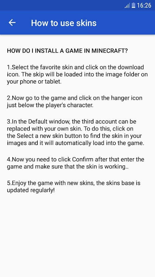 Отличный каталог самых лучших скинов для всеми известной и многим любимой игры Майнкрафт! С помощью данного приложение вы сможете установить любой понравившийся вам скин всего за пару кликов! Все что от вас требуется это зайти в приложение, выбрать скин и установить его, вот и все!