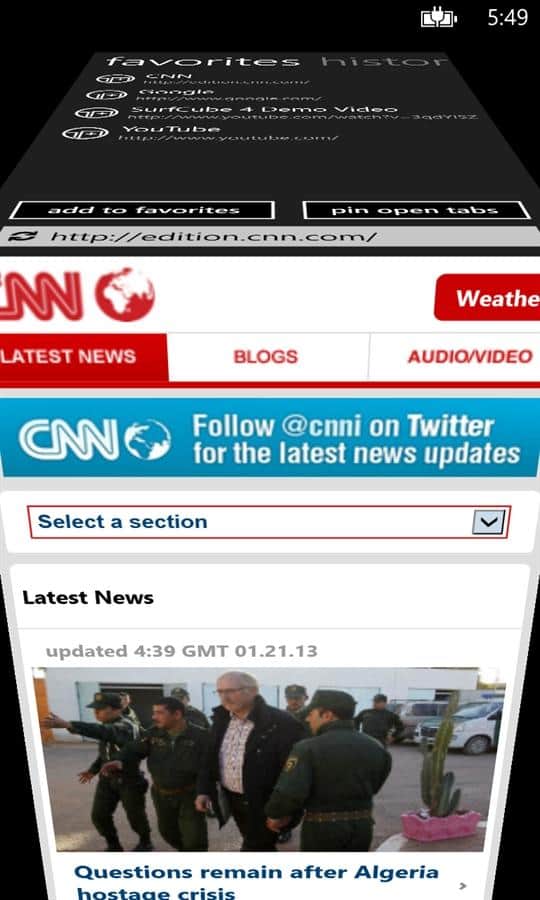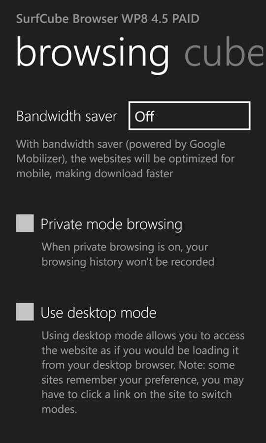 SurfCube 3D Browser - самый популярный и многофункциональный веб-браузер для windows phone. Им очень легко пользоваться, потому что весь интерфейс представлен в виде 5 стороннего куба. Это и поисковая система, закладки, настройки и история, все это может понадобится вам в любую минуту. Теперь стало на много проще пользоваться интернетом для просмотра ваших любимых сайтов.