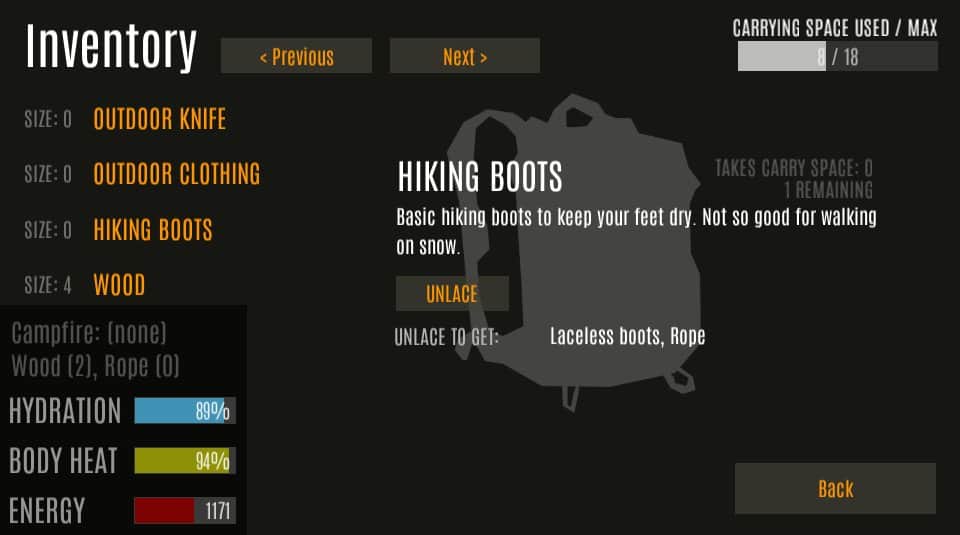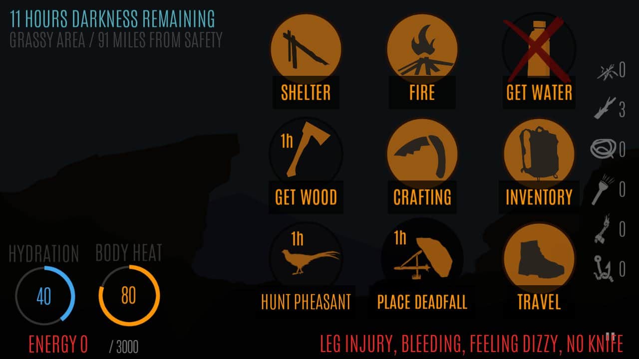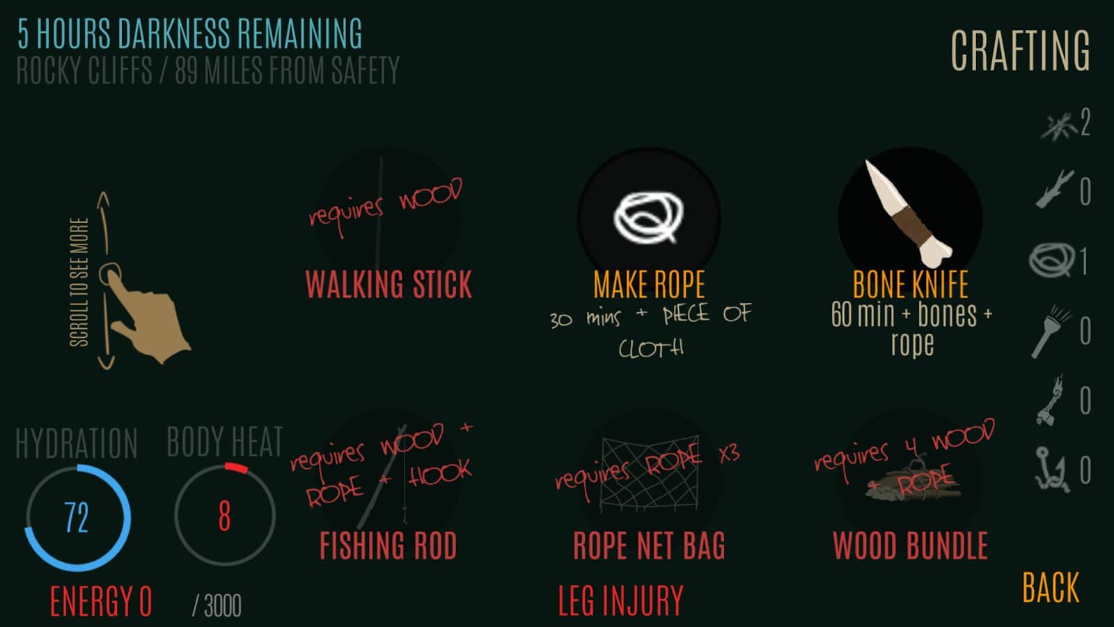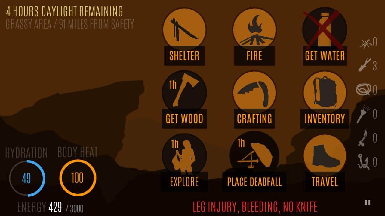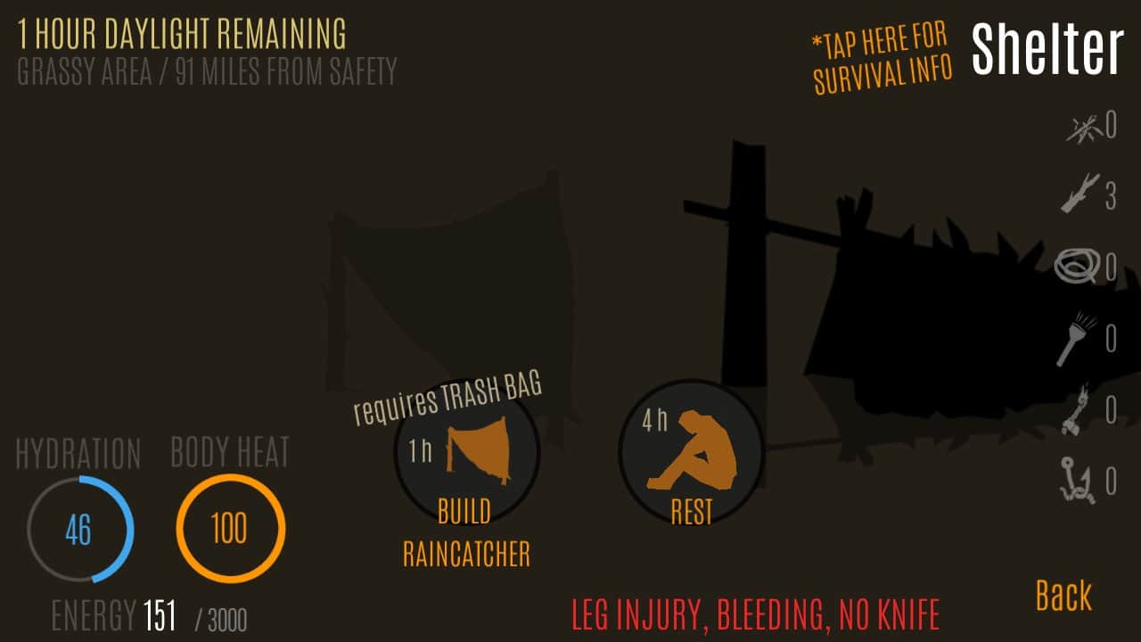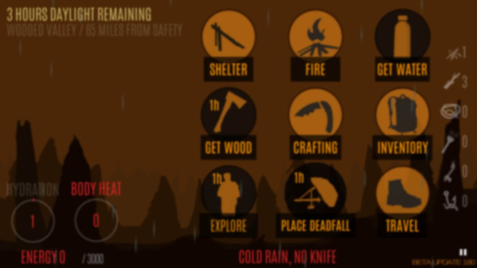 Survive - Wilderness survival - Увлекательный квест, в котором вам нужно будет выжить. Эта игра сделана таким образом, что выжить, очень не просто. Вы будете создавать убежище, чтобы поспать, разводить костер чтобы не замерзнуть. Так же вам нужно добывать еду, дерево, воду и многое другое. Вы сможете перемещаться по разным частям карты, с помощью кнопки переходов. На все действия у вас будет уходить определенное время, а значит и энергия. Если вначале вы сможете питаться тем что вам дали, то потом еду придется добыть. Нарубить деревьев, соорудить удочку и вперед, на рыбалку. Так же в зависимости от погоды, вам нужно будет менять убежище, если хотите выжить. В игре очень много элементов, так что можете сами отправится выживать, и убедится что она весьма интересная.