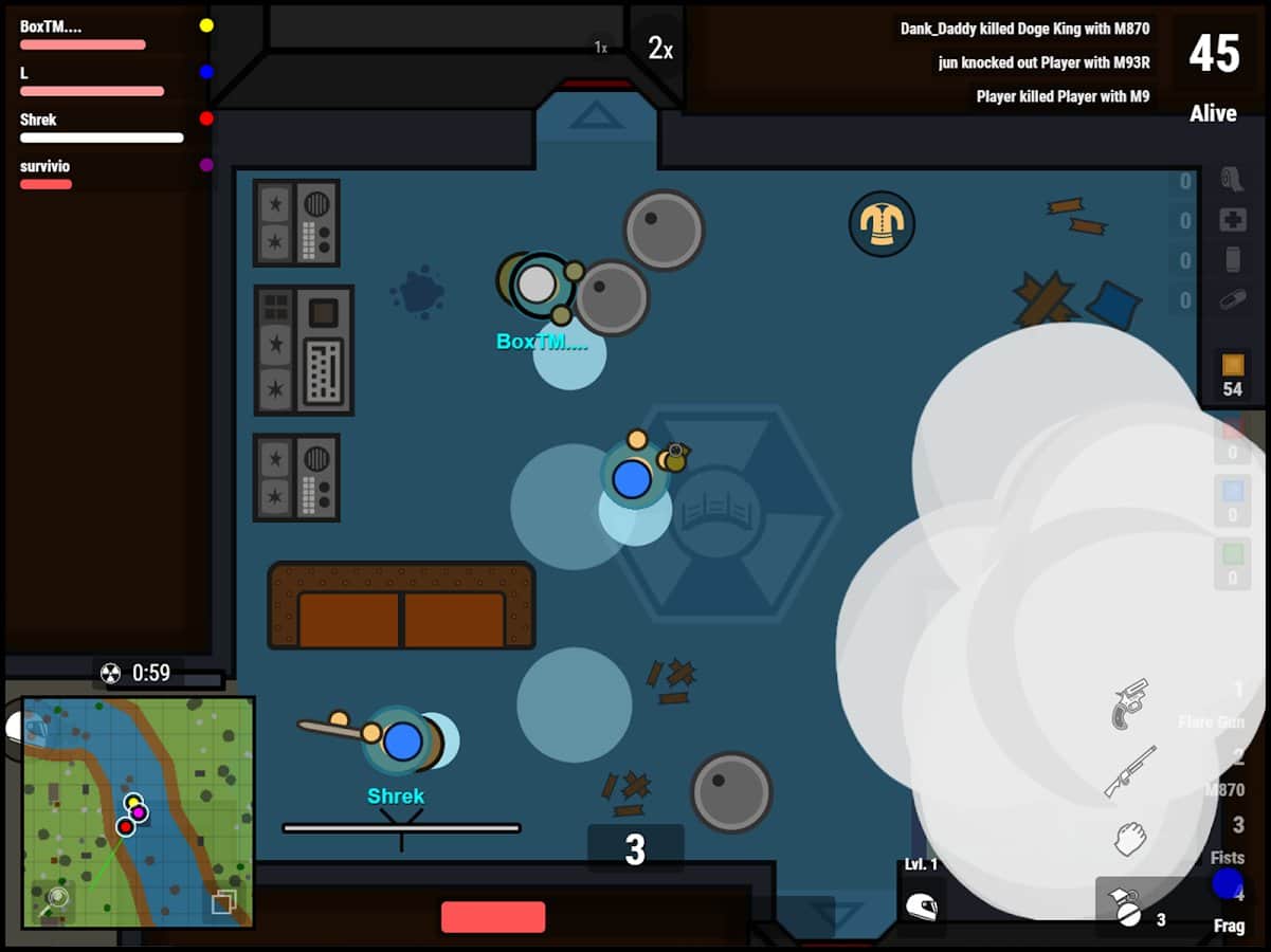 surviv.io - 2D Battle Royale – экшен на андроид с видом сверху. В этой игре вы примите участие в битве Royale которая длится от 3 до 5 минут. Возьмите под свой контроль главного героя игры и примите участие в стремительных битвах, проходящих каждый раз на различных картах. Выбирайте подходящий вам режим игры, который будет соответствовать вашему стилю – это может быть одиночная игра, сражения с партнером в дуэтах или полевой командой из четырех человек. Применяйте в битве различное оружие которое будут походить как для ближнего, так и дальнего боя. Перемещайтесь по различным локациям и собирайте оружие, броню, рюкзаки и боеприпасы.