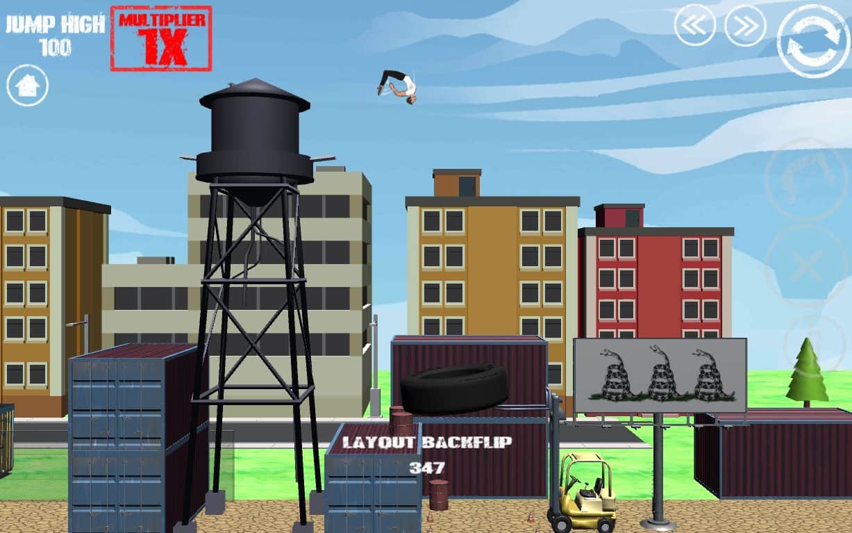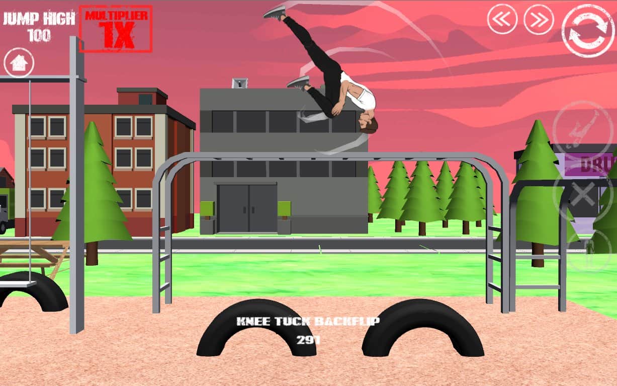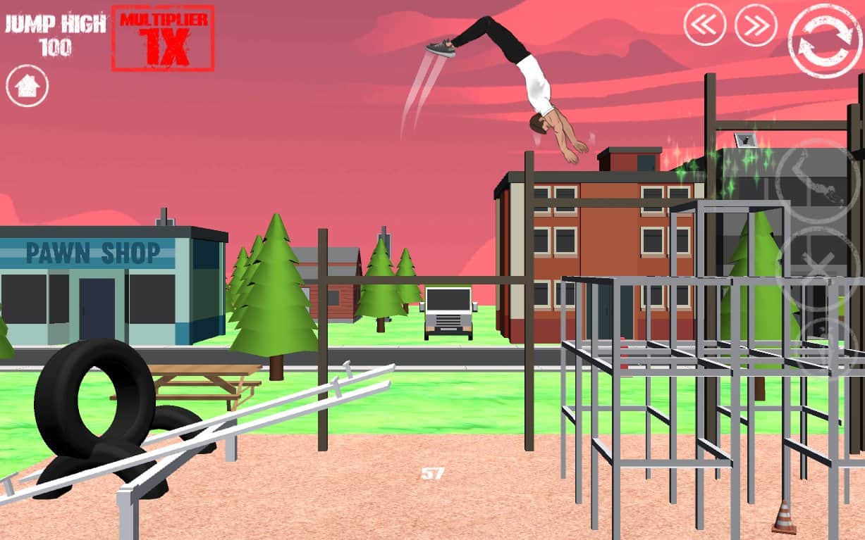 SWAGFLIP - Parkour Madness – игра на андроид, где вашей задачей будет помочь герою освоить все навыки паркура. В этой игре вы будете управлять героем, который имеет физику тряпичной куклы. Вашей задачей будет помогать герою выполнять различные трюки, перевороты, прыжки и сальто. С помощью специальных кнопок на экране вашего девайса, управляйте куклой и не дайте ему упасть или провалить прыжок, иначе уровень придется проходить заново. Заставляйте героя прыгать, делать двойные сальто и другие трюки. Всего в игре представлено три неповторимые локации, 6 различных уровней и простое управление. Играйте со своими друзьями и поднимайтесь все выше в таблице лидеров.
