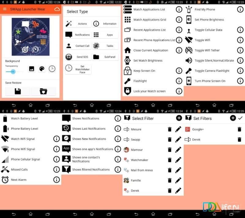 Лаунчер для Android Wear расширяет базовую функциональность операционки. Позволяет выбирать один из нескольких нестандартных циферблатов, блокировать экран часов, запускать приложения, просматривать список установленных программ и недавно запущенные приложения, как на часах, так и на телефоне. Имеется встроенный фонарик (экран часов полностью заливается белым светом). А еще есть возможность быстро отправить SOS-сообщение. Не менее интересно и управление настройками телефона с часов: изменение быстрых настроек, FindMyPhone, включение экрана и т.д.