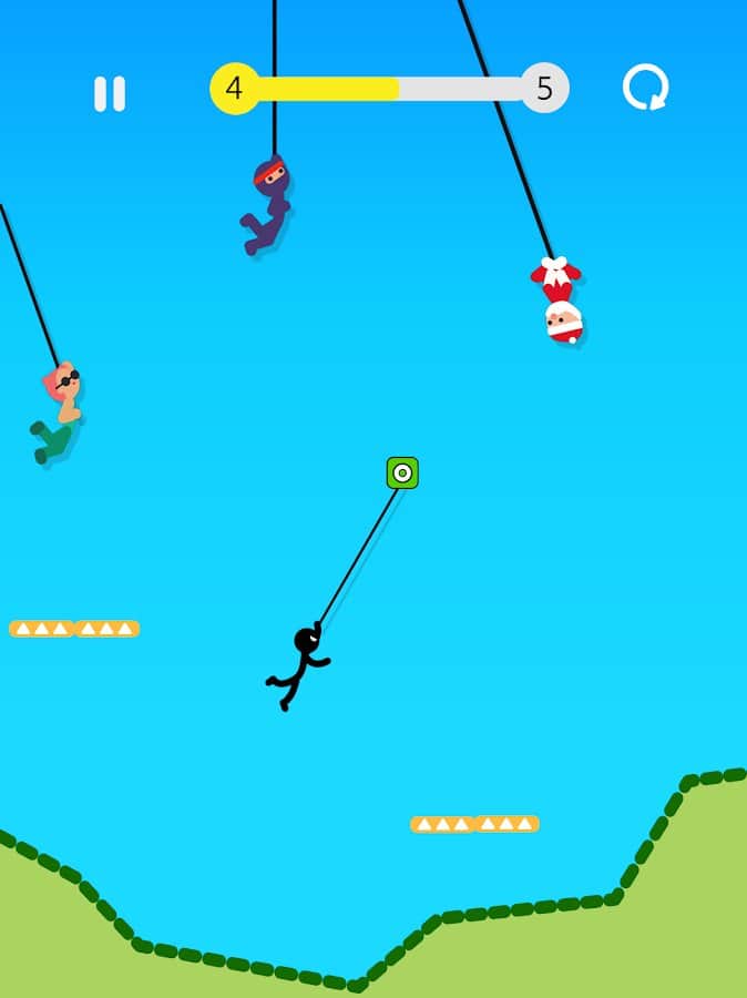 Swing Star – веселая игра на андроид, где вы будете управлять стикменом. Наш герой решил пройти как можно большее расстояние, перемещаясь исключительно по веревкам, прицепленным к платформам. Проверьте свою внимательность и точность и нажимайте в нужный момент на многочисленные платформы, чтобы ваш герой мог двигаться дальше. Поймайте веревку, качайтесь и скользите по уровням стараясь пройти нужное вам расстояние и достичь финиша. Впереди вас ждут 100 неповторимых уровней, множество тем и различные герои.