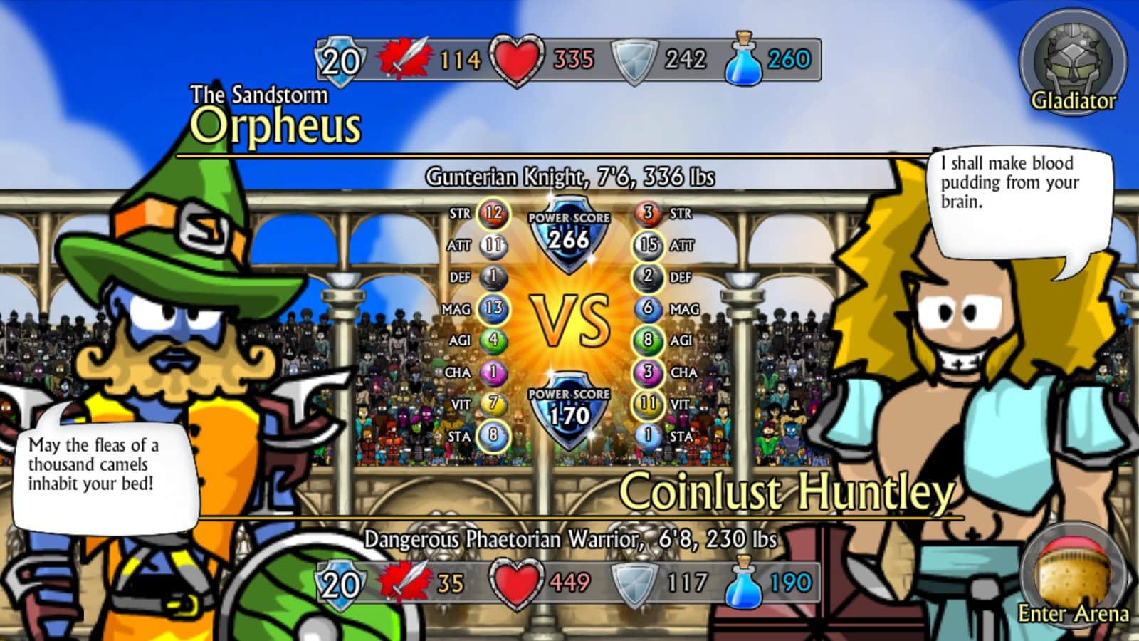 Создай и настрой своего поединщика, вложи очки в навыки, выбери свой способ калечить оппонента.