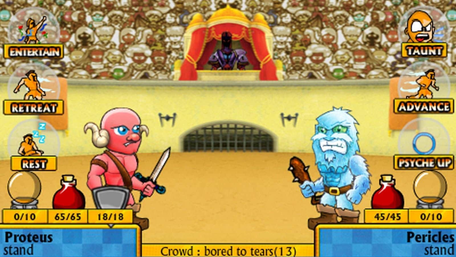 Swords and Sandals - знаменитая ролевая игра геймплей которой сочетает в себе гладиаторские сражения на арене и приключенческую составляющую в которой вам предстояло путешествовать по игровому миру. И вот создатели проекта решили порадовать нас вариацией игры в которой основной акцент сделан именно на сражения. И так, вам предстоит собрать команду гладиаторов, тренировать их и принимать участие в сражениях на арене, при этом бои будут протекать более скоротечно чем в прошлых версиях, да и боевая система построена куда более разнообразней.