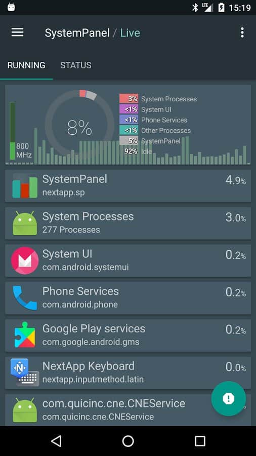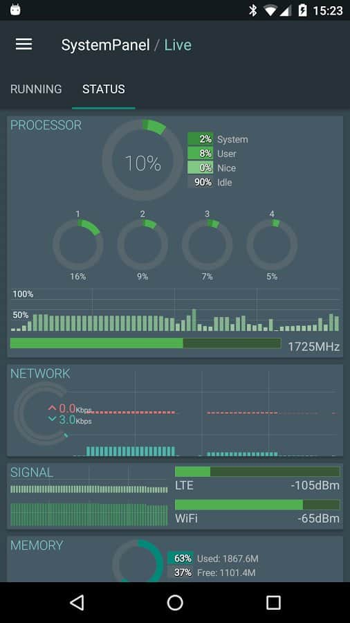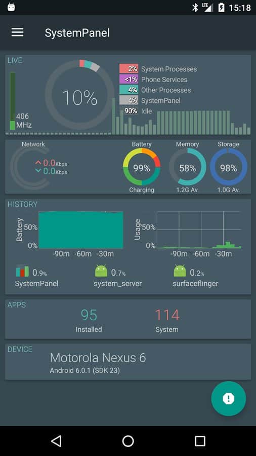 SystemPanel 2 - Это простая и очень удобная системная панель для вашего смартфона, в которой вы сможете узнать всю необходимую вам информацию о работоспособности вашего устройства. После запуска, приложение соберет кое какую информацию о вашей системе, и далее выведет все на экран в очень простом и удобном формате. Вам будут показаны такие показатели как: заряд батареи, нагрузка памяти и процессора, так же сколько всего приложений установлено у вас и сколько сейчас активно.