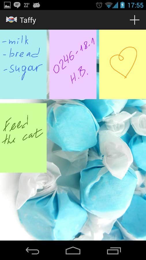 Taffy Notes - приложение позволит вам с легкостью создавать рукописные заметки. Создавайте яркие запоминающиеся заметки, и вы никогда не забудете про свои важные задачи, встречи и другие дела. Выбирайте цвет стикеров и пера, подбирайте фон. С помощью виджета вы сможете разместить свои заметки на домашний экран, в этом случае от ваших глаз ни один важный момент не будет упущен. Виджет работает на различных разрешениях экрана.