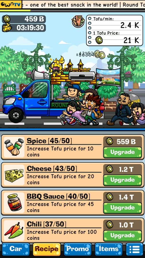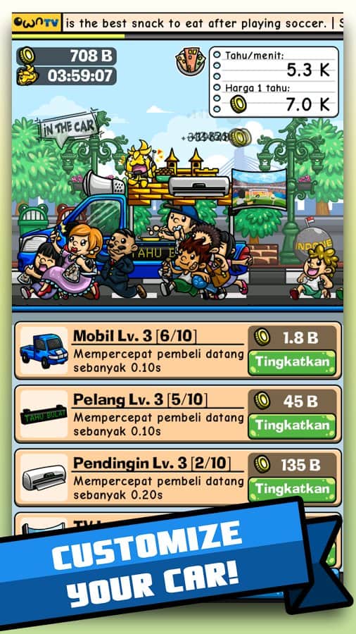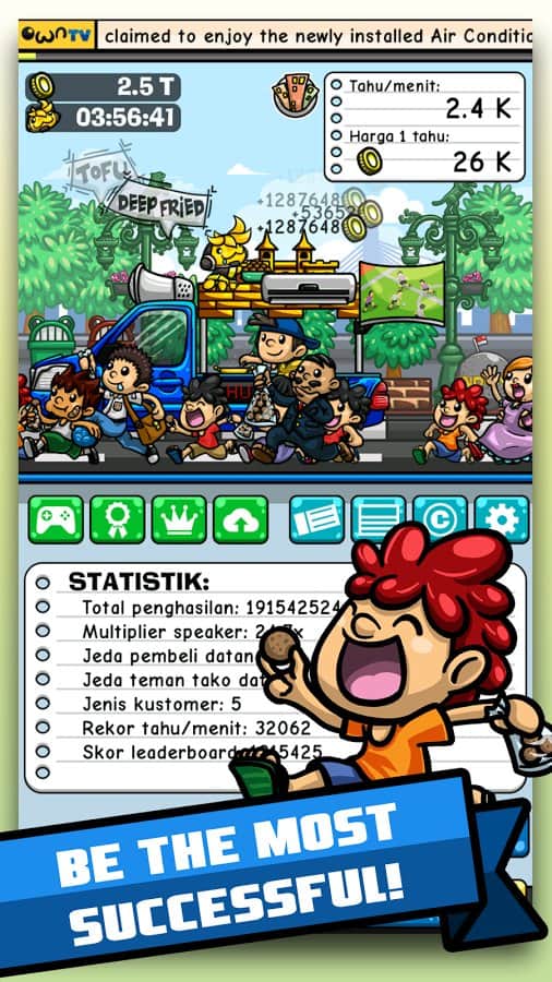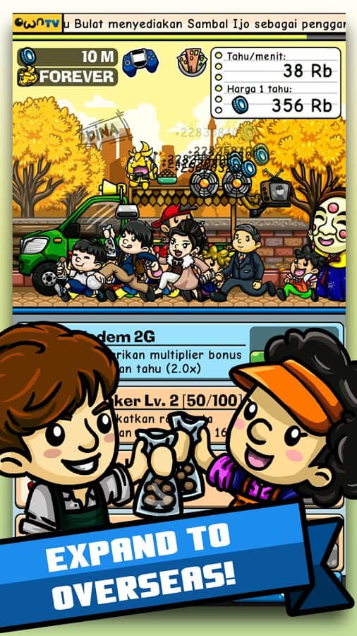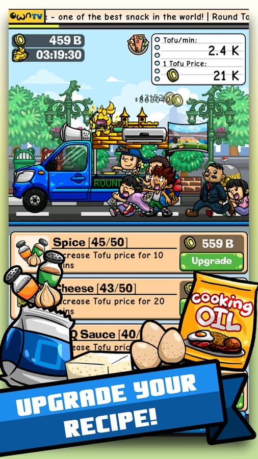 Tahu Bulat – игра на андроид, где вы будете путешествовать по различным городам и продавать свои блюда из тофу. В этой игре вы будете управлять грузовичком, который ездит по городам Индонезии и будете готовить различные блюда. Поставьте свой фургон в самом людном месте и готовьте блюда, продавая их нетерпеливым клиентам. Применяйте в приготовлении блюд различные специи и соуса, которые сделают ваши блюда еще вкуснее и придадут им потрясающий вкус. Готовьте как можно быстрее, не заставляя своих клиентов ожидать по долгу своего заказа. Ездите по разным городам и постройте свою сеть закусочных.