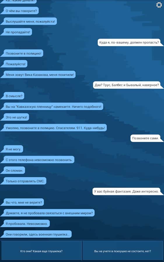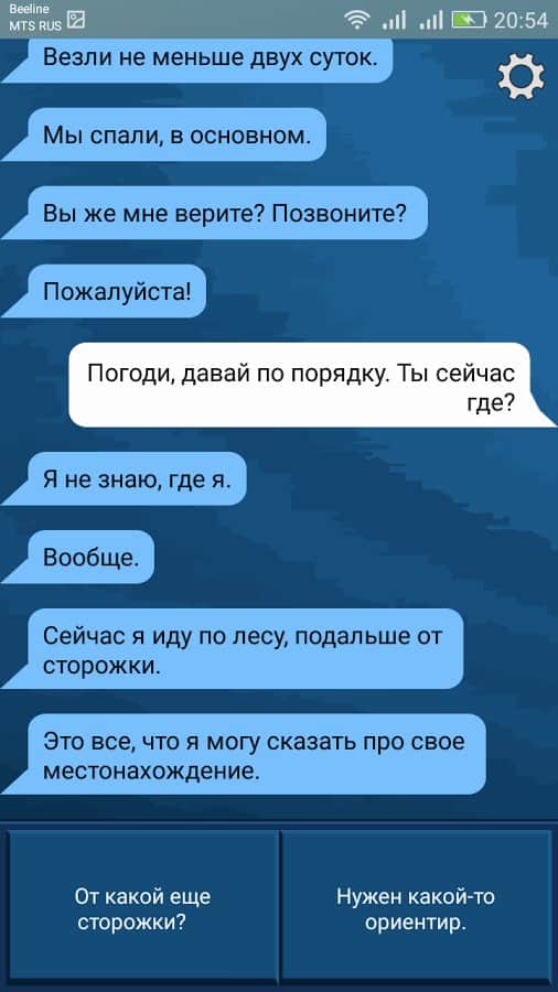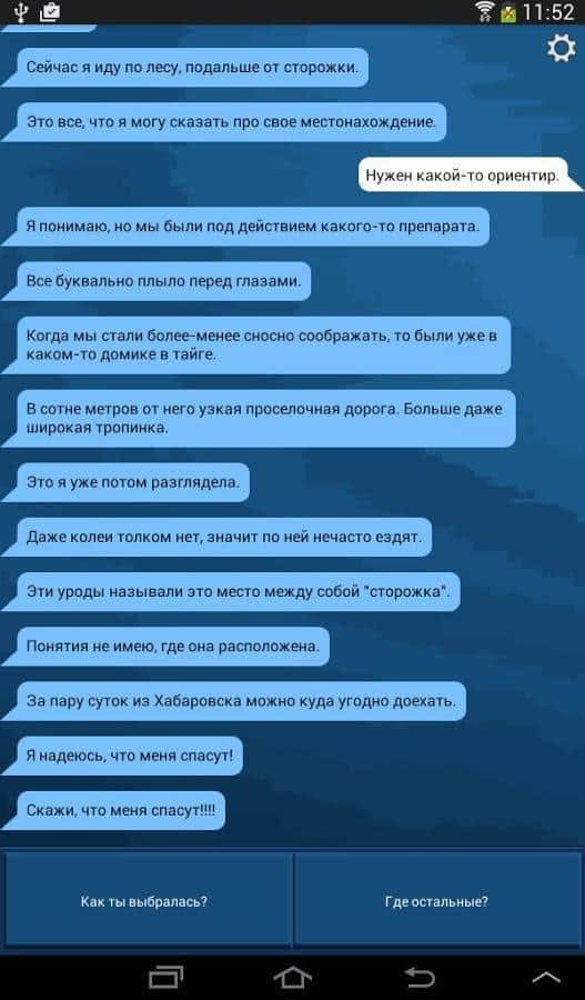 ТАЙГА - В этой игре вы узнаете удивительную историю про молодую городскую девушку, которая заблудилась в глухой тайге. По её словам, девушку похитили неизвестные люди и увезли, но она сумела бежать. При ней оказался всего один телефон и то сломан, с телефона можно отправлять только сообщения. По случайности она набрала ваш номер и отправила смс. Теперь вы единственный человек с которым Вика может поговорить. Помогите разгадать тайны её похищения и спасти девушку от смерти!