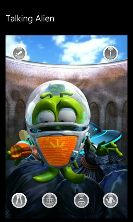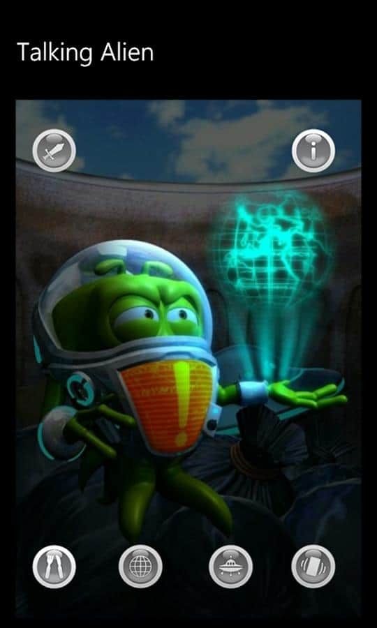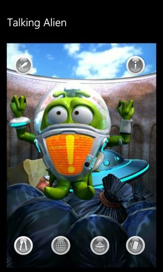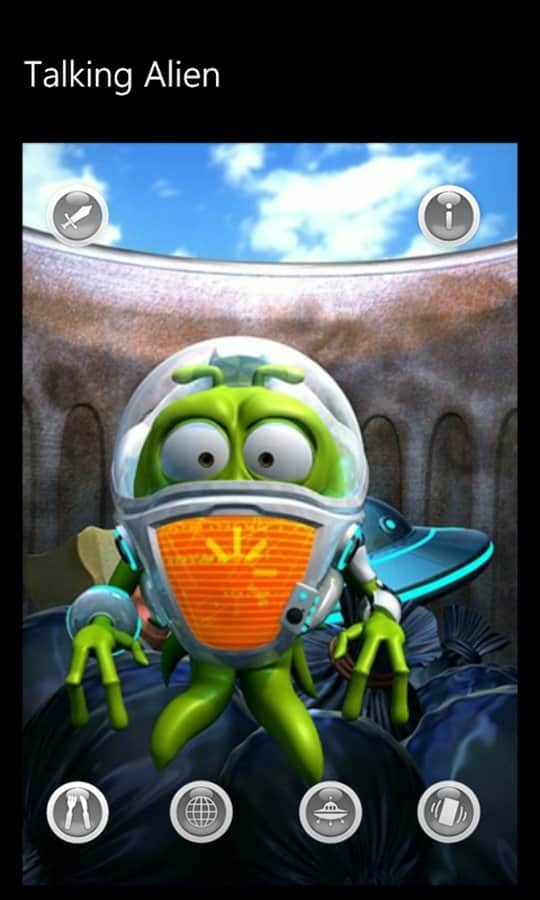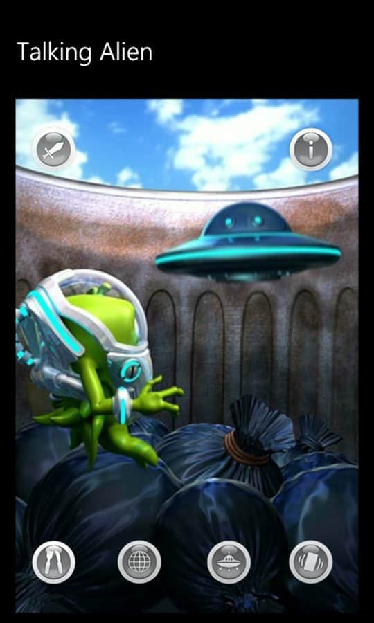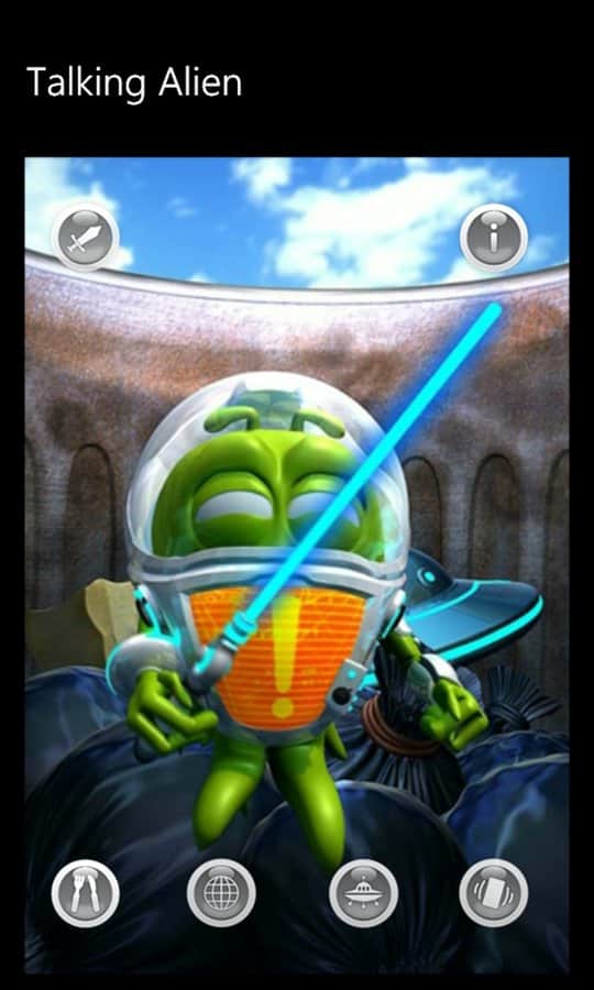 Talking Alien - игра для windows phone, где вы найдете себе смешного друга инопланетянина. Он пришелец, прилетевший на планету Земля вместе со своими товарищами в космическом корабле. К сожалению, космический корабль разбился при посадке, и он остался единственным выжившим в миссии. Ален застрял в пустынном месте, где нет ни кого, и никто не развлекает его. Он одинок. Вы можете помочь ему развеселится.