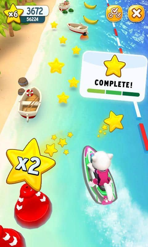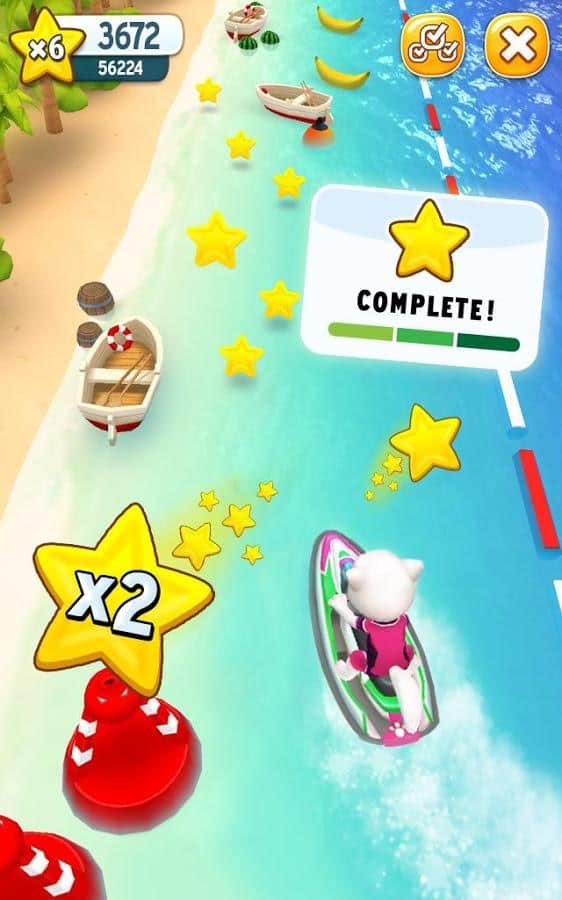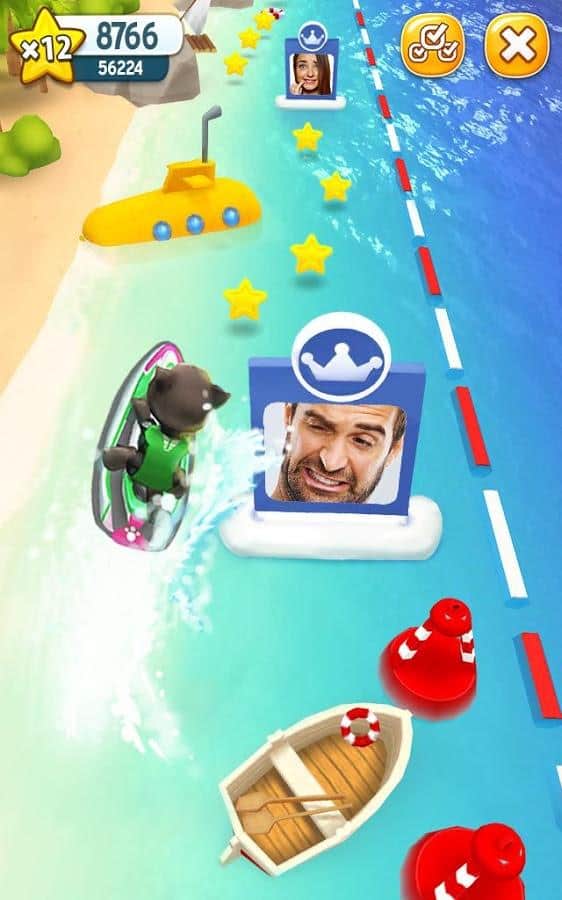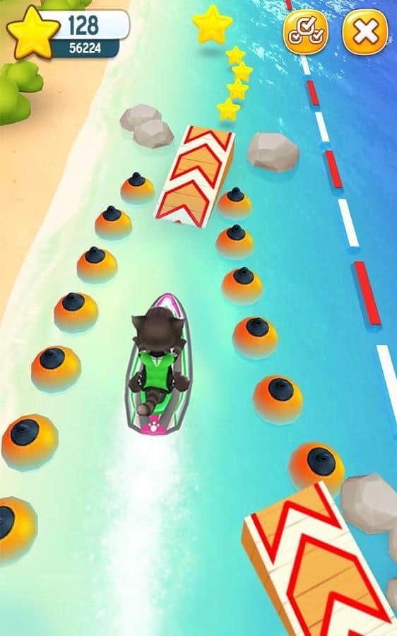 Talking Tom Jetski – динамичные гонки на скоростных гидроциклах, в компании говорящего кота Тома и его подруги Анджелы. Выбирайте за какого героя вы будет играть и начните свою гонку. Садитесь за руль гидроцикла и приготовьтесь выполнять опасные миссии, преодолевая различные препятствия в виде буйков, камней, бомб и лодок и при этом, не забывая собирать полезные бонусы и звезды. Маневрируйте между препятствиями и на огромной скорости преодолевайте трассы. На собранные звезды приобретайте новые гидроциклы и открывайте новые увлекательные миссии. Соревнуйтесь с друзьями и устанавливайте свои рекорды.