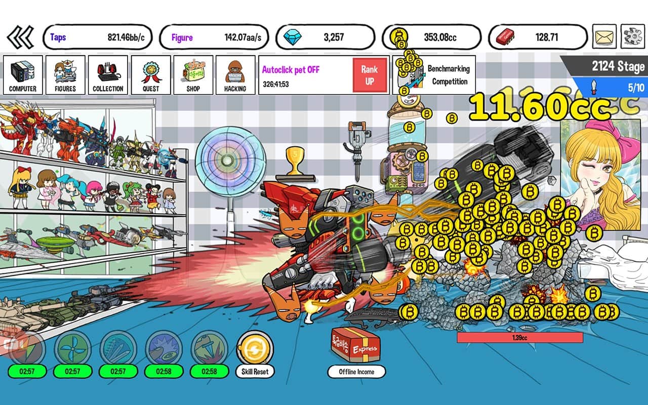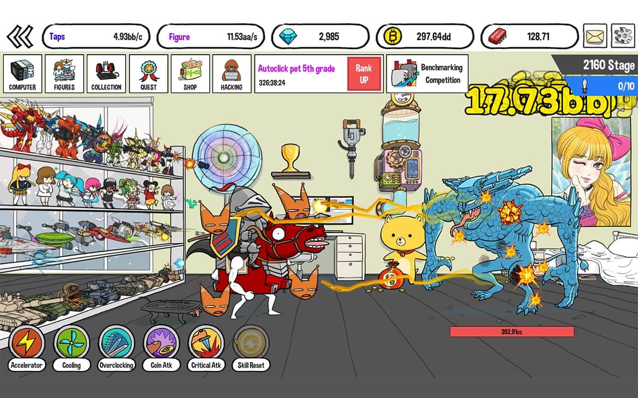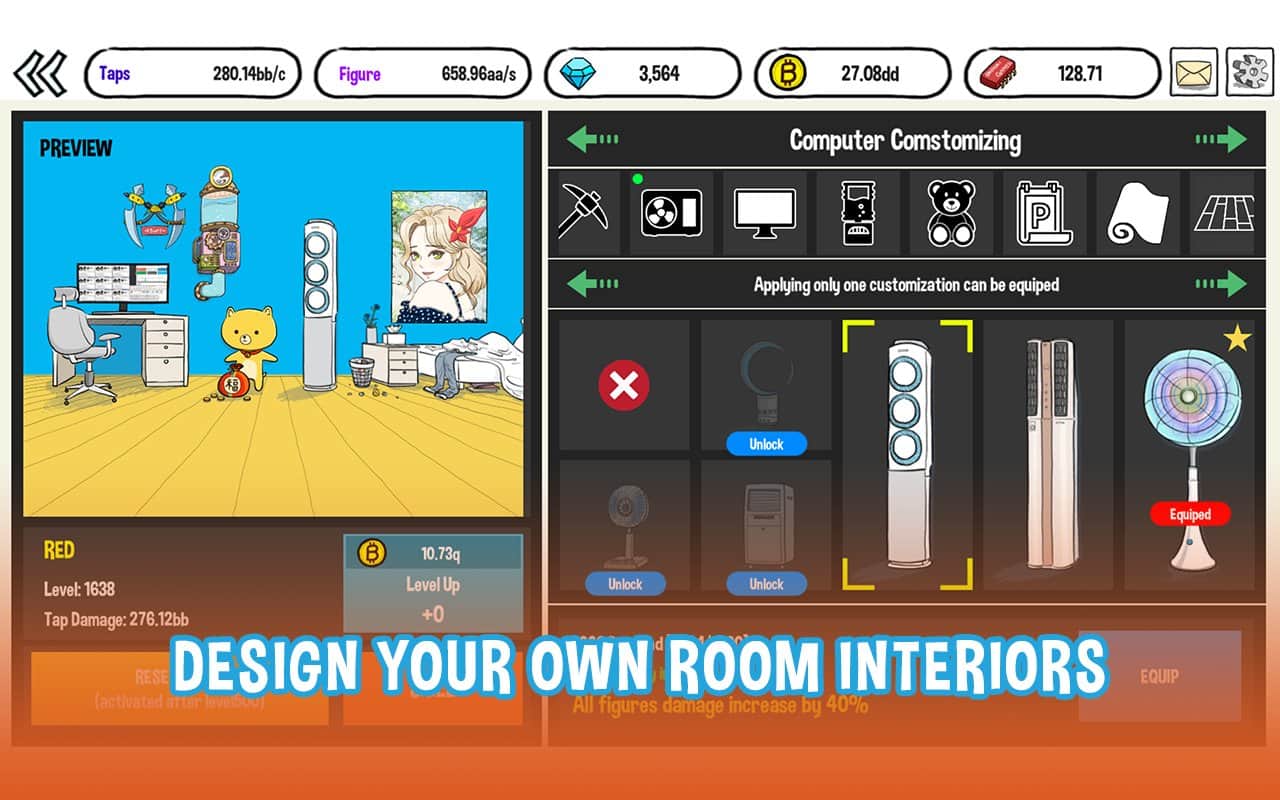 Tap Tap Computer – веселый кликер на андроид, с мультяшной графикой. В этой игре вам будет выделена отдельная комната, которая будет оснащена новейшим кондиционером, огромным монитором и мощными машинами. В этой игре вы будете управлять милым виртуальным персонажем который должен вступить в битву с мощным монстром биткоином. В этой игре вашей главной задачей будет прокачивать своего персонажа готовя его к битве с биткоином. Обновляйте детали своего компьютера делая его более мощным и продемонстрируйте мощные способности. Украшайте интерьер своей комнаты и станьте хакером с большой буквы. Участвуйте в еженедельных соревнованиях в категории бенчмарк.