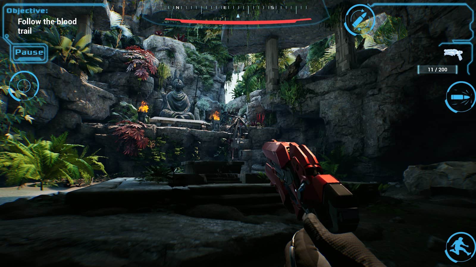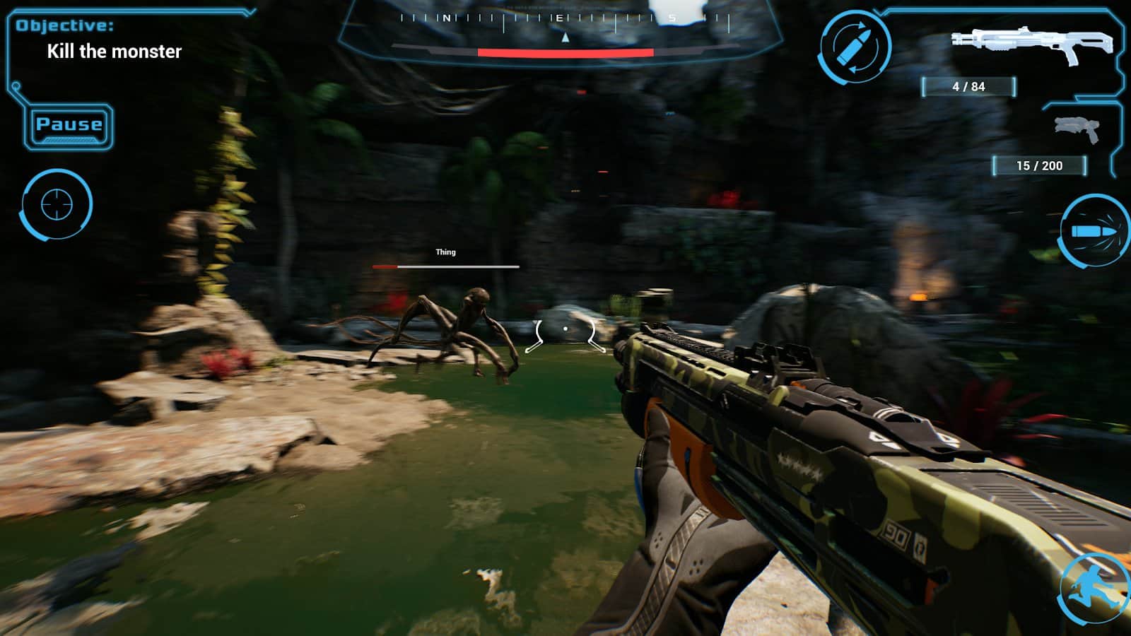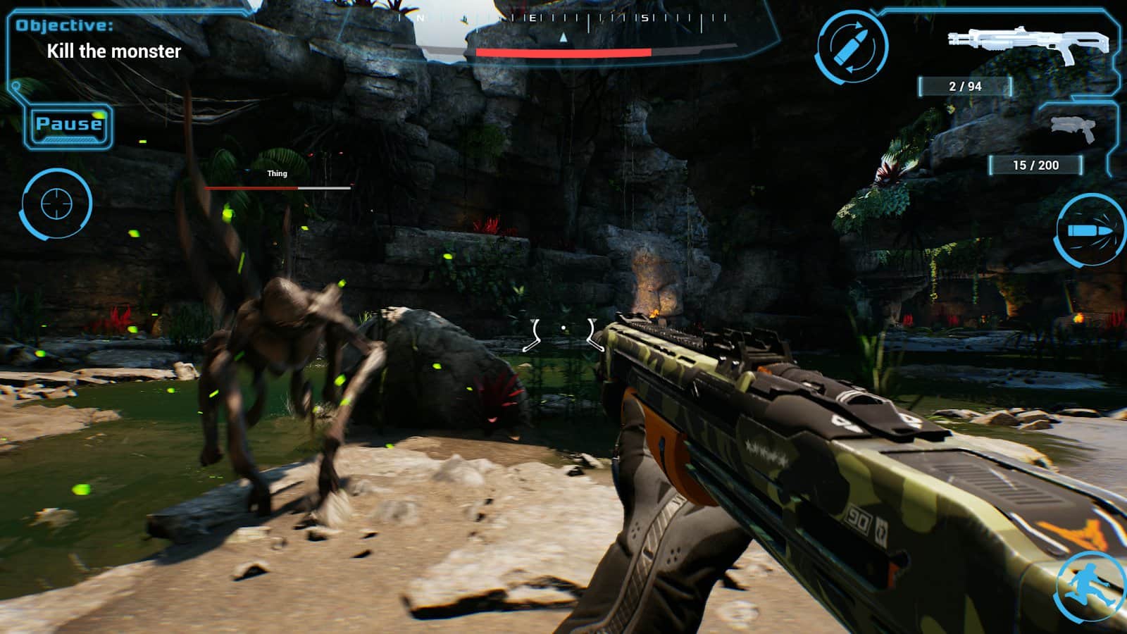 От этой игры идёт вайб н.о.в.ы, будто это невышедшая четвёртая часть. Интерфейс и оружие в похожем стиле, а верхняя синяя полоска жизни/энергии только с н.о.в.ой у меня и ассоциируется. Невероятно жаль что такие амбициозные ребята которые были чуть ли не crytek в мире мобильных игр (кто бы что не говорил про геймлофт) не смогли вывязти этот проект. Игра имеет потрясающий визуал. Графика выглядит шикарно, освещение, текстуры, тени, ощущение будто это какая-то некстген ААА игра для консолей, а не мобильный бенчмарк. Если я удивлялся начальной катсцене из третьей новы, то тут я и вовсе слов подобрать не могу, да даже от интро с робо-мухой. Если без контекста показать сотни человек начальную катсцену с взрывающимся гигантским космическим кораблём из которого летят спасательные капсулы и главный герой приземляется на густозаросшую планету с мутантами, ни один из них даже не предположит что это мобильная игра и что она оказалось провальной и не вышла никуда дальше демо-бенчмарка. Дизайн окружения как никак да интересный, будто планета Пандора из Аватара, или та же самая n.o.v.a. Вроде и что-то обычное, но джунгли с динозавро-мутантами выглядят хорошо, тем более что разрабы были на опыте после монстров из дед эффект. Геймплейно из себя это демо мало что представляет, бегаешь по джунглям изредка наводя прицел на врагов которые выглядят красиво, но тупые. Минибосс правда был хоть немного отличающимся от остальных врагов, бежал на тебя, иногда перебивался на кидание камней, плювание кислотой и криком, а также зарывался в землю, ничего особо необычного.