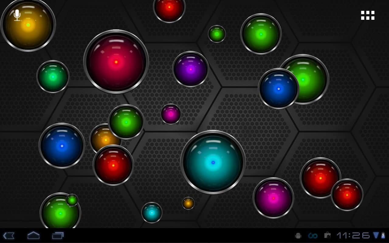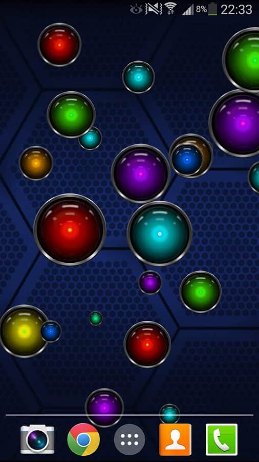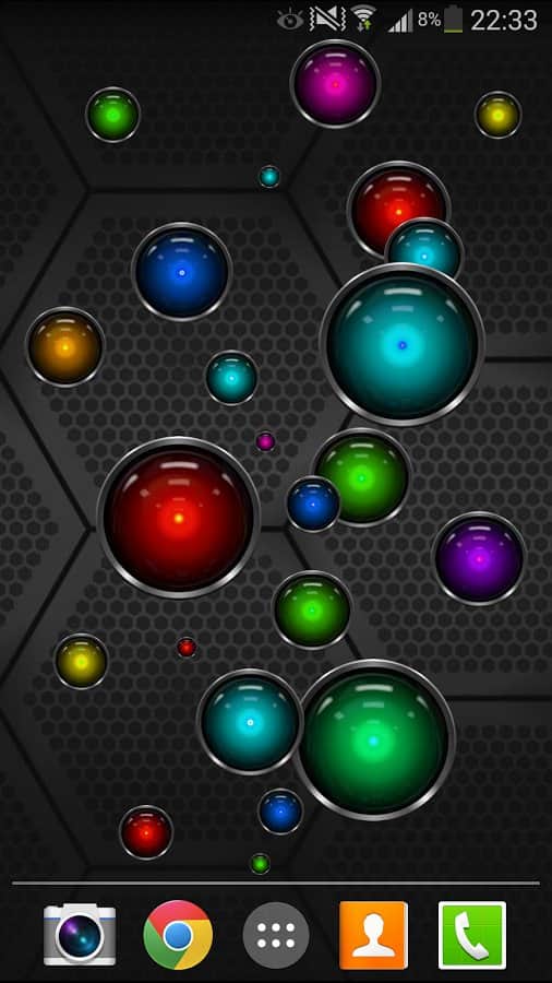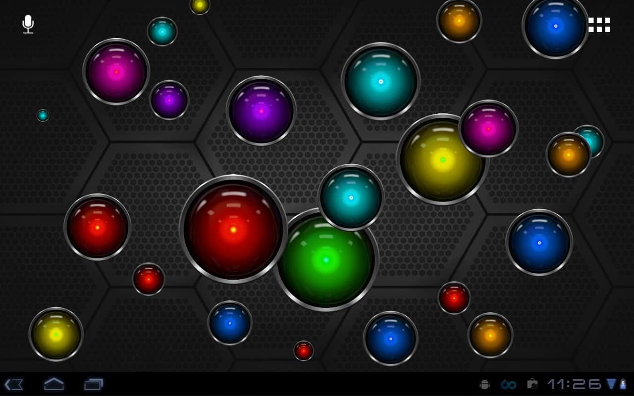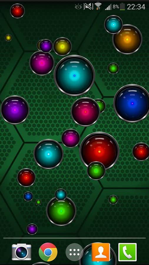 Tech Bubble Live Wallpaper – яркие живые обои на андроид с большим количеством разноцветных шариков, которые будут путешествовать по экрану вашего смартфона. Выберете один из пяти фонов, настройте количество шариков-пузырей на экране и играйте в мини-игру лопая их. Скачиваем, устанавливаем, наслаждаемся!