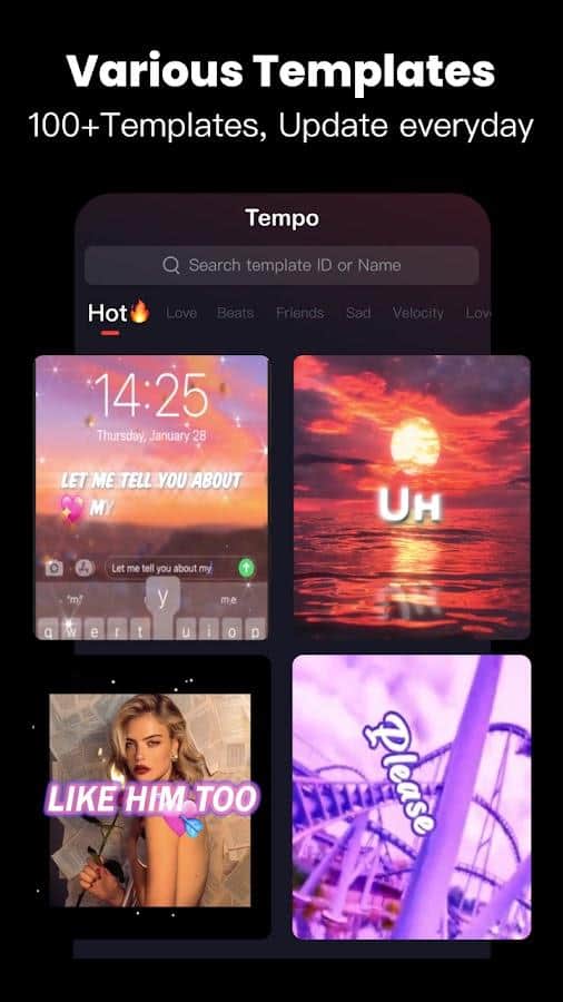Tempo - Редактор видео с музыкой - Выберите шаблон, в котором хотите отредактировать видеоролики так, как вам хочется. У вас есть возможность определить категорию и посмотреть, какие варианты там есть: любовь, тексты песен, смайлики, мультфильмы, прочее. Добавьте сопровождающую музыку в видео, соберите фотографии для видеороликов, наложите интересные спецэффекты и сделайте необычные переходы. Каждое видео можно сделать уникальным с помощью загруженных изображений, текстов, шрифтов, анимаций и других данных. В самом конце вы можете с легкостью поделиться результатом в соцсетях.