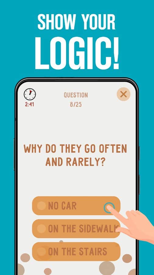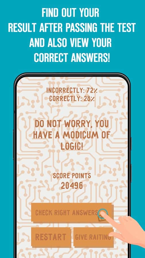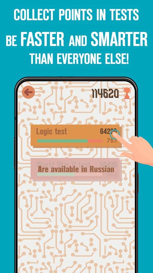 Проверьте уровень своего интеллекта, пройдя "Тест на логику - тест на IQ" и соревнуйтесь в людьми всего мира. В приложении нет скучных и легких головоломок, которые может пройти даже школьник. Здесь собраны интересные и уникальные логические и психологические тесты, развивающие воображение, память, смекалку, интеллект и мышление. Викторины и вопросы тестов всегда содержат "изюминку" и нестандартное решение. Выбирайте один из трех вариантов ответа, играйте в режиме оффлайн без подключения к интернету.