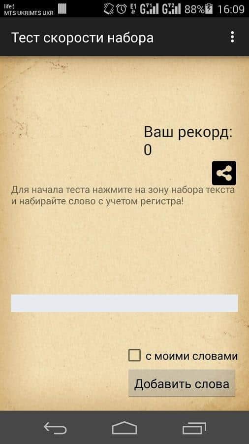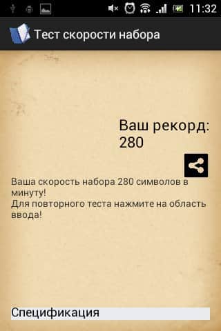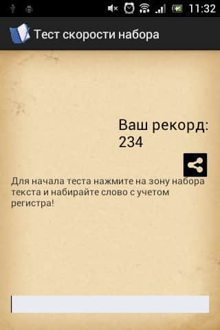 Тест скорости набора текста – интересное приложение для любознательных пользователей андроид в отношении скорости набора текста на своем устройстве. Все просто! Вы набираете текст, программа, в свою очередь, выдает сколько символов вы набираете в минуту. Хороших рекордов!