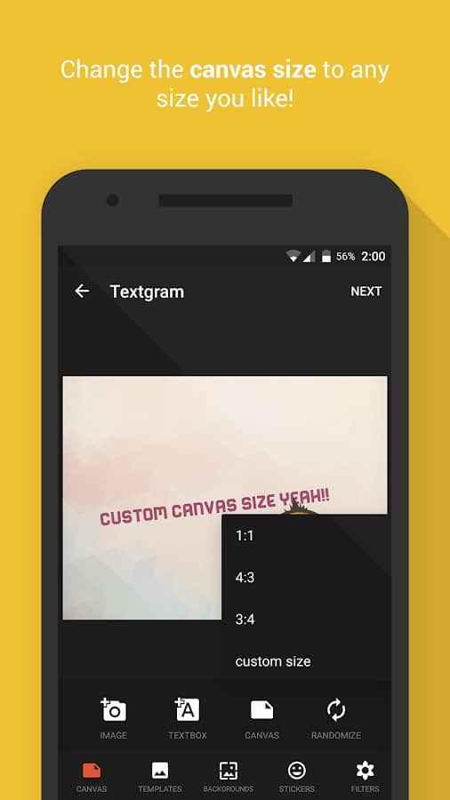 Textgram – прикольная программка на андроид для создания красивых граффити. Установите бесплатно приложение и делитесь своими шедеврами с друзьями на Instagram, Facebook, Twitter, Whtatsapp, Viber, Skype, SMS, MMS, с помощью электронной почты. Программа Textgram Pro проста в управлении, есть с воможность поворота текста и самое главное это - отсутствие рекламы!