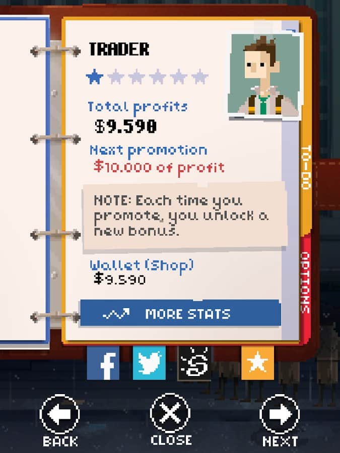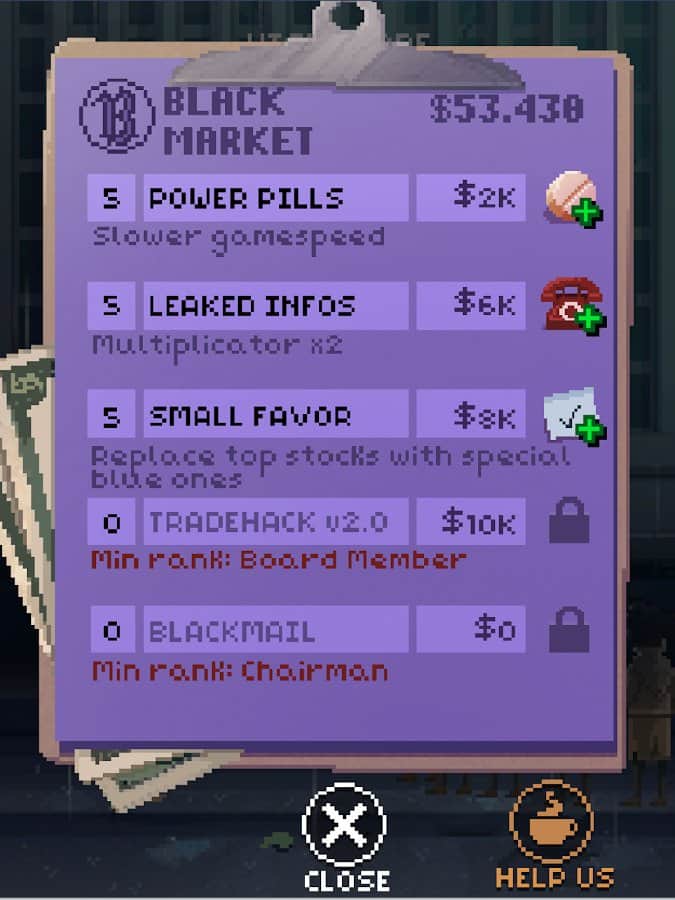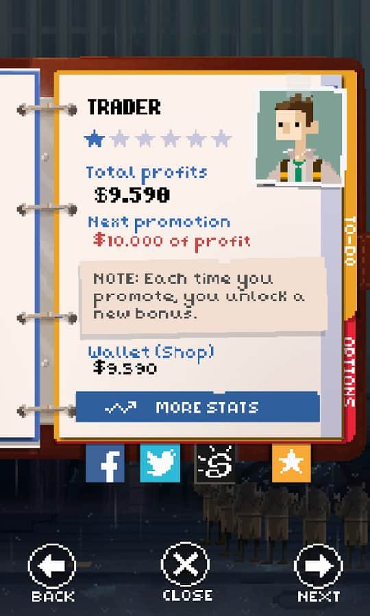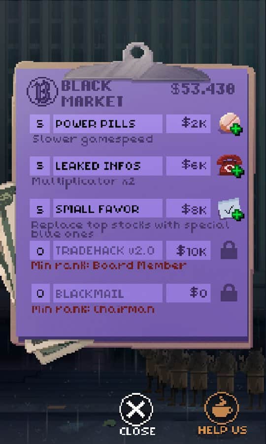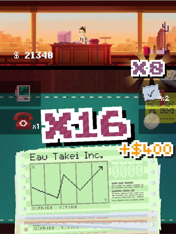 К вам поступает целый поток сводок, справок, аналитических записок и прочего, необходимо реагировать на значение графиков и свайпами продавать или покупать. Совершив несколько провальных действий вас уволят, а место тут же займет следующий кандидат. При успешной деятельности ваш герой будет сутками пропадать на работе стараясь заработать денег и произвести впечатление на начальство. И это вопрос времени, когда его настигнет нервный срыв и он напортачит. Получив извещение для него останется единственный выход - это прыжок с крыши. Так что геймерам необходимо беречь своих аватаров.