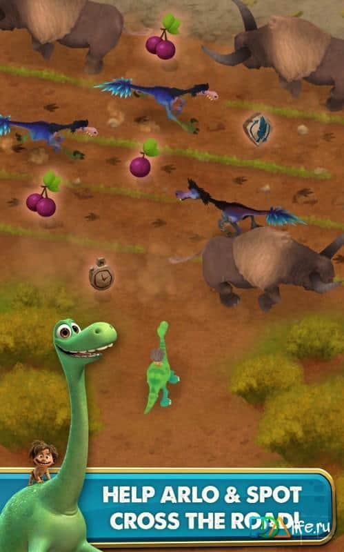 The Good Dinosaur – официальная игра, сделанная по сюжету одноименного мультфильма Дисней. В этой игре вы познакомитесь с добрым динозавром по имени Арло и маленьким мальчиком Спотом. В игре вы отправитесь в доисторический мир, где правят динозавры и будете там выживать. Помогите динозавру и его другу пойти по опасным землям как можно дальше и при этом уклониться от злых птеродактилей и хищных динозавров, которые захотят вас съесть. Пересекайте реки, поля, пропасти и другие препятствия и собирайте фрукты и бонусы. Каждый новый уровень порадует вас различными мирами и отличными бонусами.