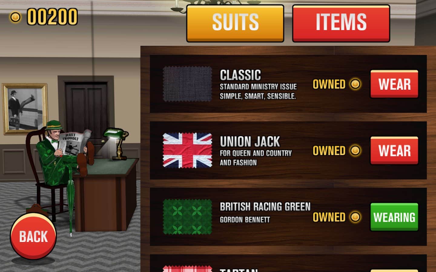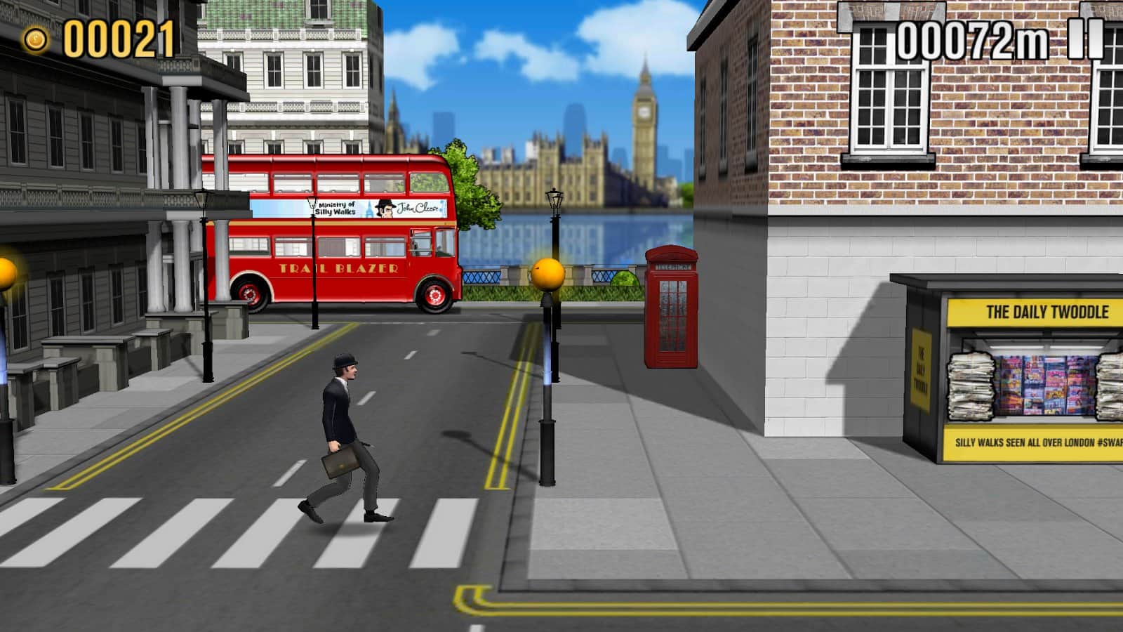 The Ministry of Silly Walks - Увлекательный раннер на андроид, который выполнен в стиле платформера. Вас ждет увлекательное путешествие вместе с забавным героем из Монти Пайтон, который решил прогуляться по Лондону. Прыгайте через препятствия, собирайте монеты, и не забывайте наклонятся перед висящими балками. В игре есть возможность менять костюмы игрока, тратя собранные деньги.