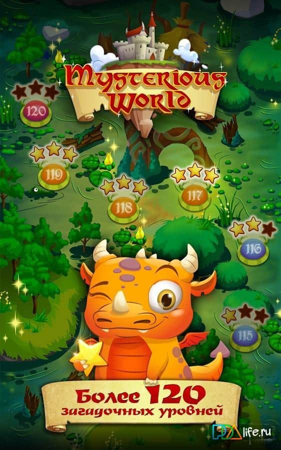 Загадочный мир / The Mysterious World - Замечательная головоломка «три в ряд» на андроид! Вас ждет незабываемое приключение в месте с забавным героем игры – маленьким дракончиком, которому надо спасти свою возлюбленную. Злой колдун похитил ее, и теперь нашему герою предстоит собрать всю свою храбрость и побороть его.
