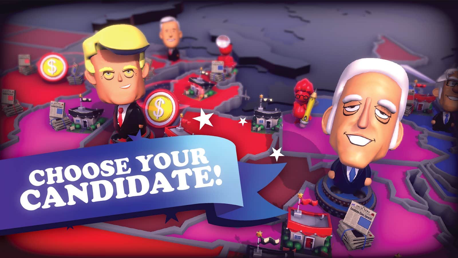 Выберите своего любимого кандидата из числа демократов или республиканцев. Не нравится ни один из нынешних кандидатов? Нет проблем, просто создайте свою собственного и примите некоторые по-настоящему дикие идеологии. Например, запретите все видеоигры - они погубят ваш мозг. The Political Machine 2020 имеет уникальные деревья идеологии для кандидатов, позволяющие получить уникальный опыт для каждого прохождения! Зарабатывайте очки идеологии в ратушах и используйте их для решения определенных проблем. Важно набрать 270 голосов в коллегии выборщиков, поэтому вам нужно обратить внимание на то, что беспокоит избирателей в колеблющихся штатах. То, что хорошо играет в Техасе или Калифорнии, может повредить вам в Огайо или Флориде. Отправляйтесь на предвыборную кампанию и покажите нации, почему вы должны стать следующим президентом Соединенных Штатов Америки.