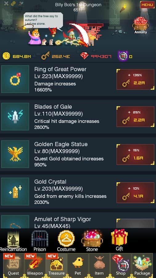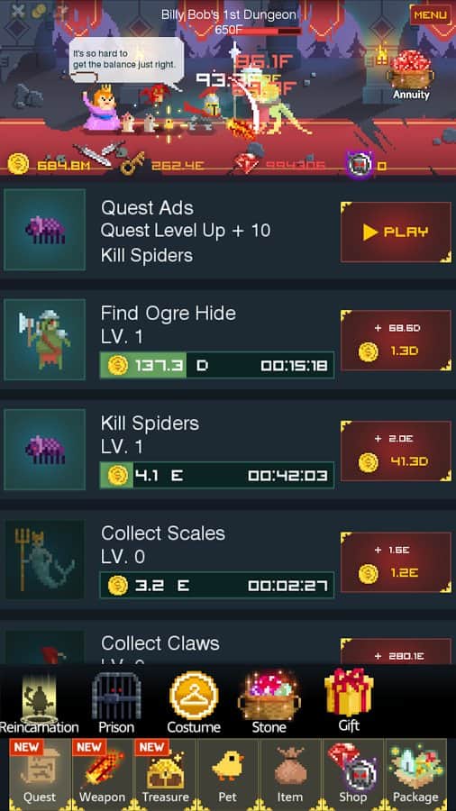 The Prince Billy Bob – экшен на андроид, сделанный в пиксельной графике где вам предстоит управлять отважным героем. Наш отважный рыцарь перемещается по мрачному подземелью и уничтожает там разных противников, которые встречаются у него на пути. Ваша задача состоит в том, что вам необходимо вовремя подбирать и улучшать оружие своего героя и добавлять ему снаряжение. Рыцарь перемещается по уровням автоматически. Каждый уничтоженный монстр или враг подарит вам определенное количество золота и драгоценных камней. Используйте эти драгоценности, чтобы улучшить своего героя и победить все зло находящиеся в этой игре.