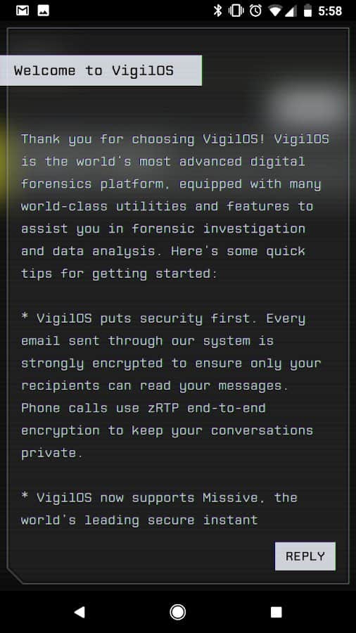 The Vigil Files: Case 1 – детективная игра на андроид, действия которой будут происходить в режиме реального времени. В этой игре вы будете использовать ViqilOS платформу которая позволит вам отправлять электронную почту, текстовые сообщения, взламывать компании и расшифровывать коды. Вашей главной задачей в этой игре будет разгадать тайну исчезновения всего человечества. Учитывайте то что докопаться до истины будет не так и просто, как кажется на первый взгляд вам необходимо будет положиться на свое острое мышление и изобретательность.